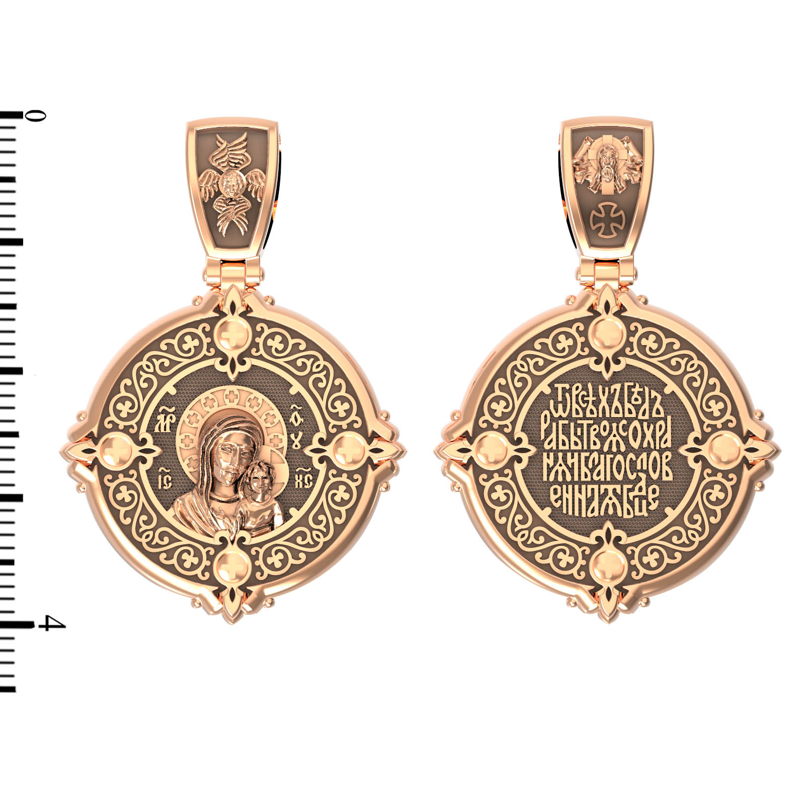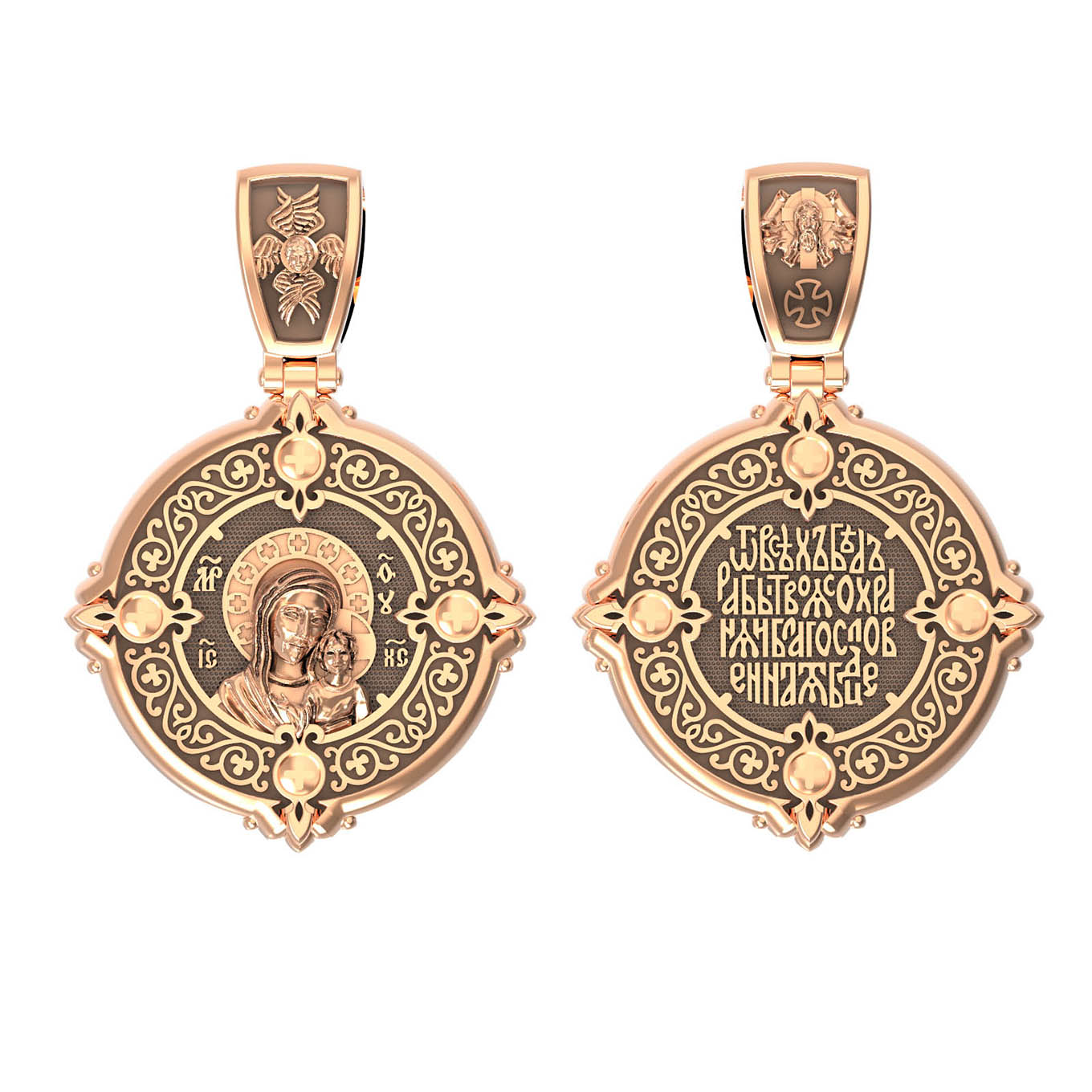 На обороте написана молитва к Богородице: «От всех бед рабы Твоя сохраняй, Благословенная Богородица!». На кулонном кольце изображен Спас Нерукотворный — Символ вочеловечившегося Божества и шестикрылый Серафим — самый приближенный к Господу Ангел.
