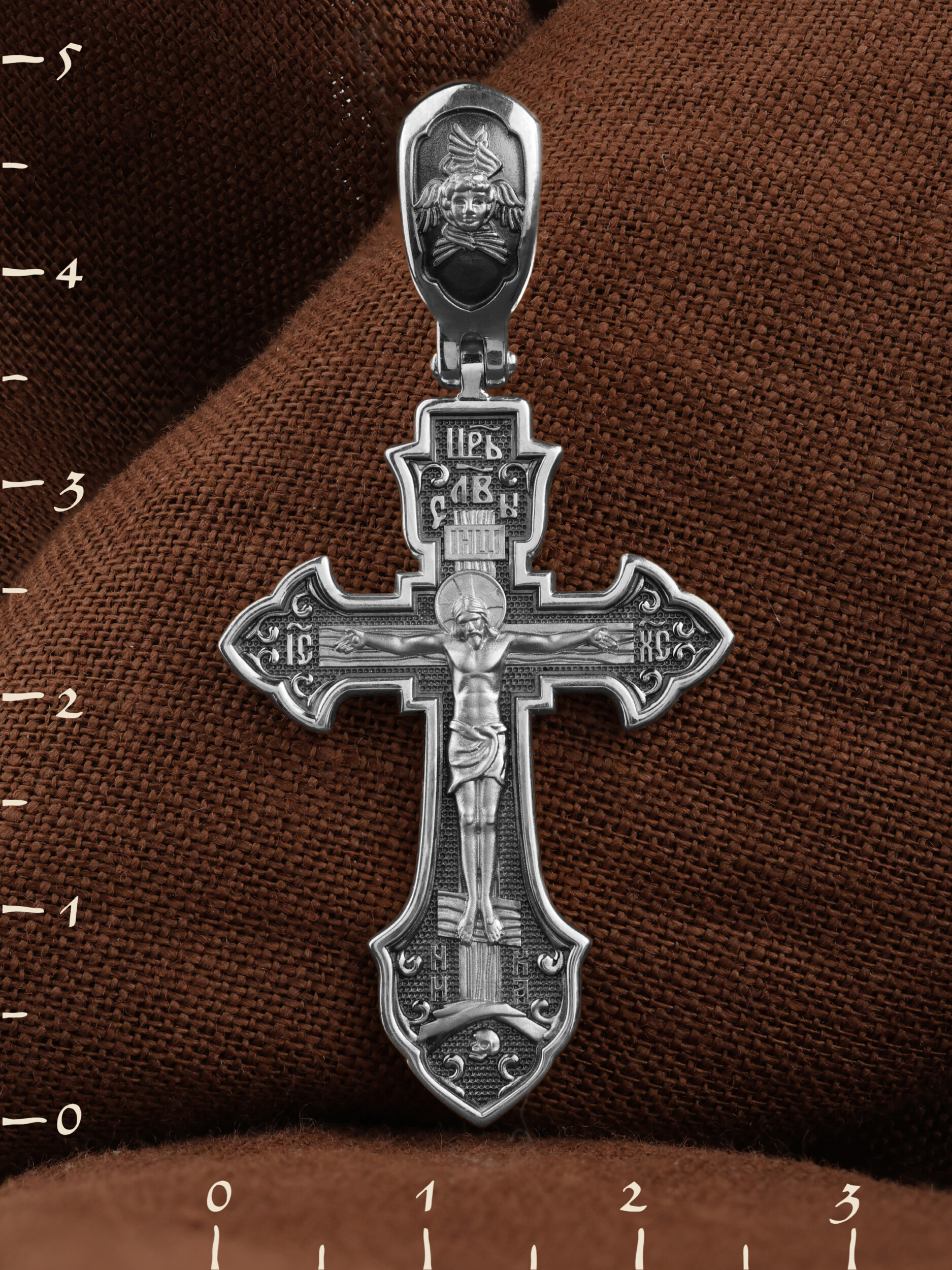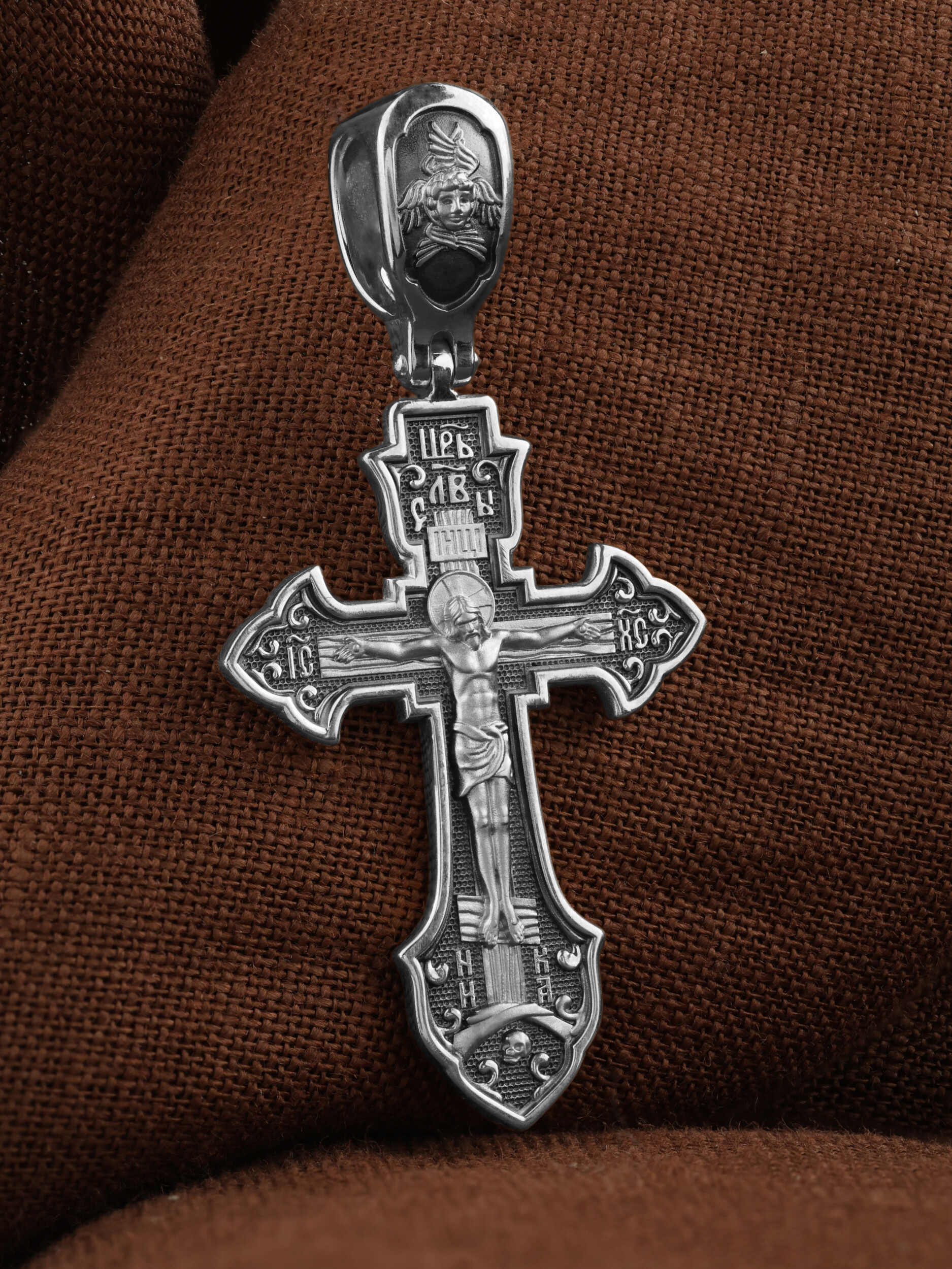 На лицевой стороне этого креста центральную часть занимает икона Распятия Христа — образ жертвы, принесенной Господом за грехи людей. Именно ко Христу, сошедшему на землю ради нашего спасения, возносятся все молитвы. Рядом с Его образом помещены слова — «НИКА» и «Царь Славы». Эти слова характеризуют Господа как Великого Архиерея, победителя смерти. Также Распятие сопровождается надписями, олицетворяющими Христа — это святое имя Христа «IC» (Иисус) «ХС» (Христос). Венчает лицевую сторону креста надпись «Царь Славы». На кулонном кольце помещено изображение Спаса Нерукотворного.