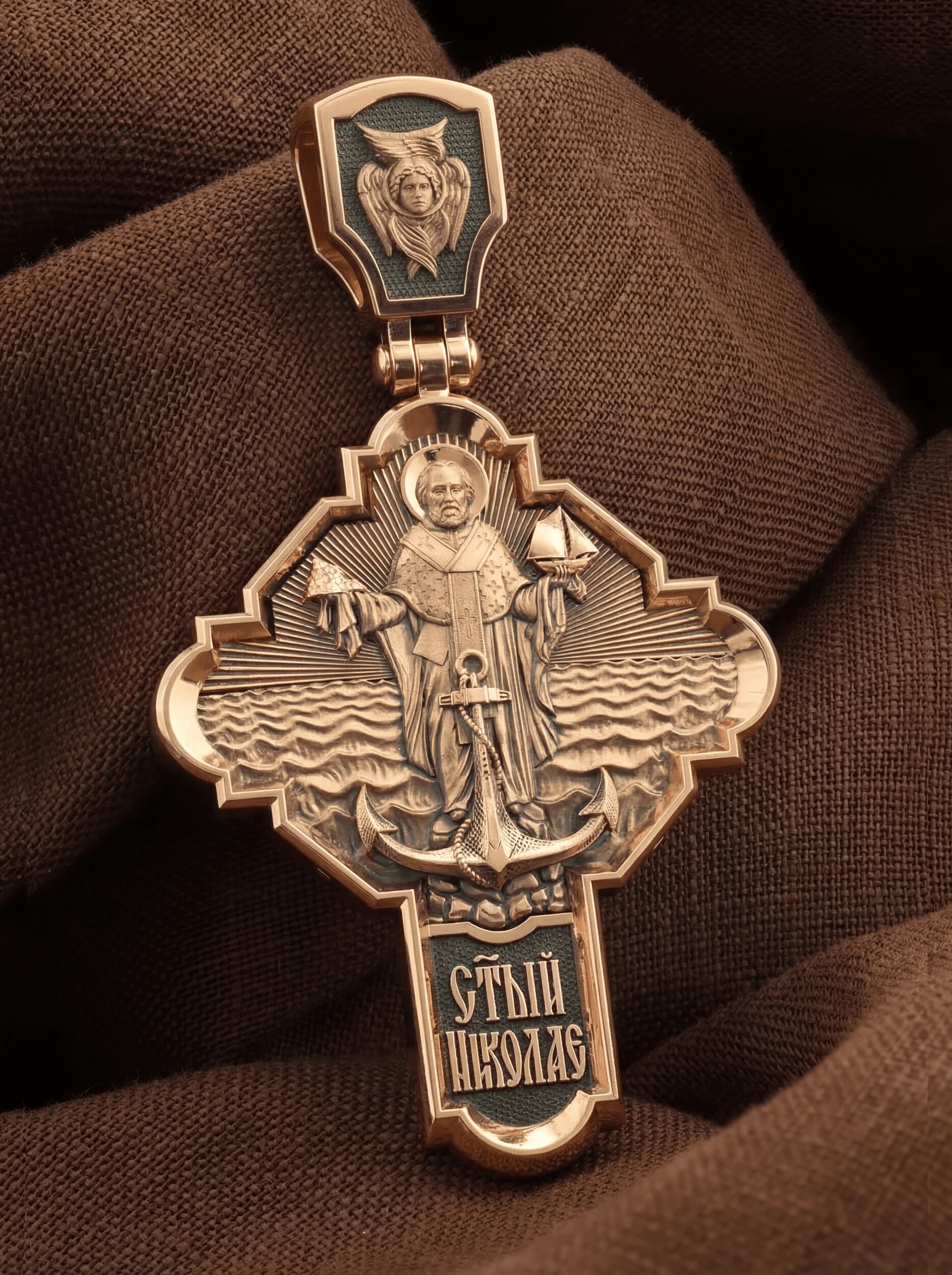 На оборотной стороне креста изображен Святитель Николай архиепископ Мир Ликийских, Чудотворец. Он является одним из самых почитаемых святых в православном мире. Много великих и преславных чудес сотворил на земле и на море великий Святитель Николай Угодник. Он помогал сущим в бедах, укрощал штормы, спасал от потопления и выносил на сушу из глубины морской, освобождал из плена и приносил освобожденных домой, избавлял от уз и темницы, защищал от посечения мечом, освобождал от смерти и подавал многим различные исцеления, слепым прозрение, хромым хождение, глухим слух, немым дар слова. Святитель Николай Чудотворец изображен стоящим в полный рост в лодке. В деснице святой держит мыс Горн, а в левой — корабль. Эта икона была написана путешественником и священником Фёдором Конюховым. Во время одного из своих путешествий, проходя пролив Дрейка, Фёдор, понимая, что выжить в такой бушующей стихии невозможно, стал молиться Святителю Николаю Чудотворцу. Он мысленно пообещал себе: «если пройду мыс Горн, то построю часовню Николаю Чудотворцу»… И в следующий миг, совсем неожиданно — волны утихли. Яхта Конюхова благополучно прошла опасный участок пути. Вернувшись домой, Фёдор Конюхов построил часовню в благодарность за свое спасение.