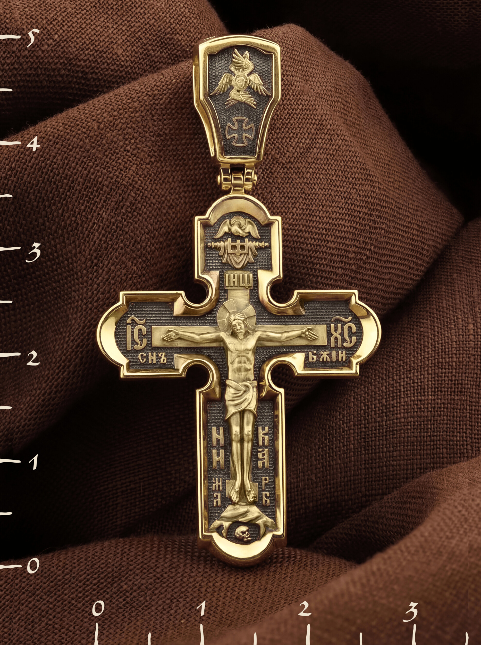 На лицевой стороне креста изображено Распятие Господа и Спасителя нашего Иисуса Христа. Христос, подвергнутый на кресте мучительной казни, своими страданиями искупил нас от древнего греха и даровал нам жизнь вечную. Без Распятия не было бы Воскресения Христова, и поэтому Крест из орудия казни обратился в святыню, в которой действует Благодать Божия. Над Распятием изображен Дух Святой в виде голубя, сходящего с Небес. Распятие сопровождается каноническими надписями. На верхней табличке, выше головы Иисуса, расположена надпись, составленная Понтием Пилатом на трех языках — «IНЦI». Она означает «Иисус Назорей, Царь Иудейский». Надпись «IС ХС» означает Иисус Христос и помещается на разных сторонах поперечной (большой) перекладины креста. Ниже — словосочетание «СЫН БОЖИЙ», что означает божественную природу Иисуса Христа. Крест стоит на горе камней, символизирующих Голгофу. В ее основании различается череп — это голова Адама. Надписи «Ника», что означает Победитель, и надпись «МЛРБ» — «место лобное рай бысть», что означает место лобное стало раем, размещены в нижней части креста. На кулонном кольце изображен шестикрылый Серафим.