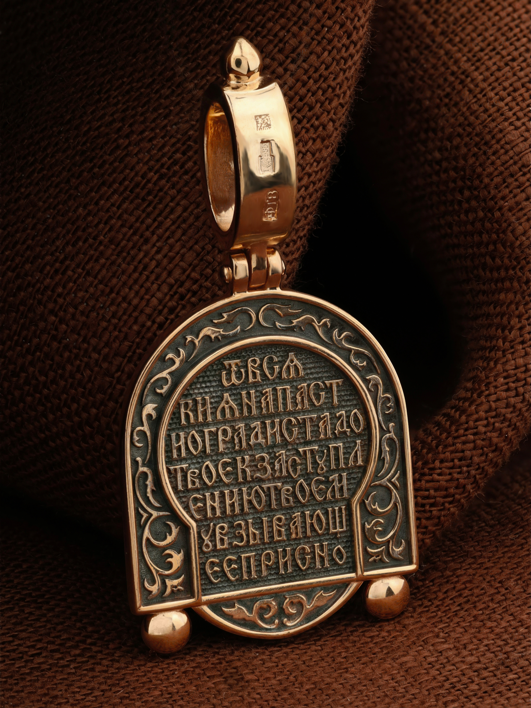 На обороте образка написана молитва Богородице в честь Ее иконы «Всецарица» (Пантанасса): «От всякия напасти огради стадо Твое, к заступлению Твоему взывающее присно».
