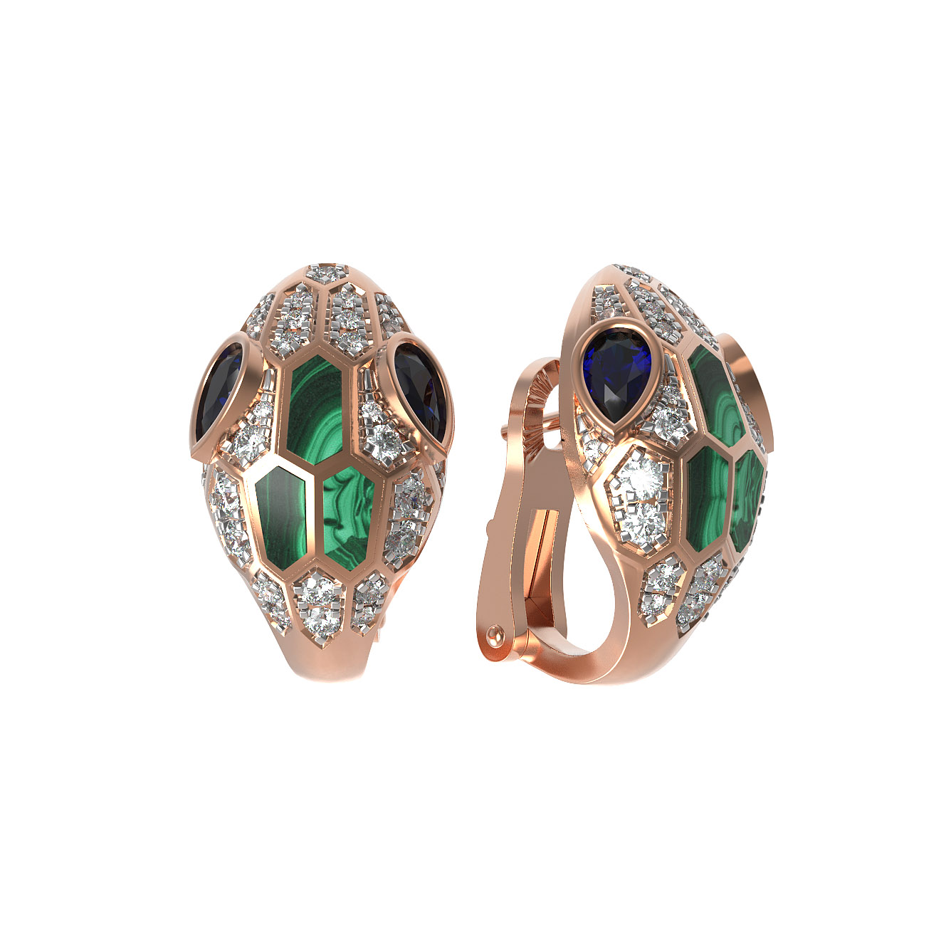 Серьги из золота c бриллиантами, сапфиром и малахитом