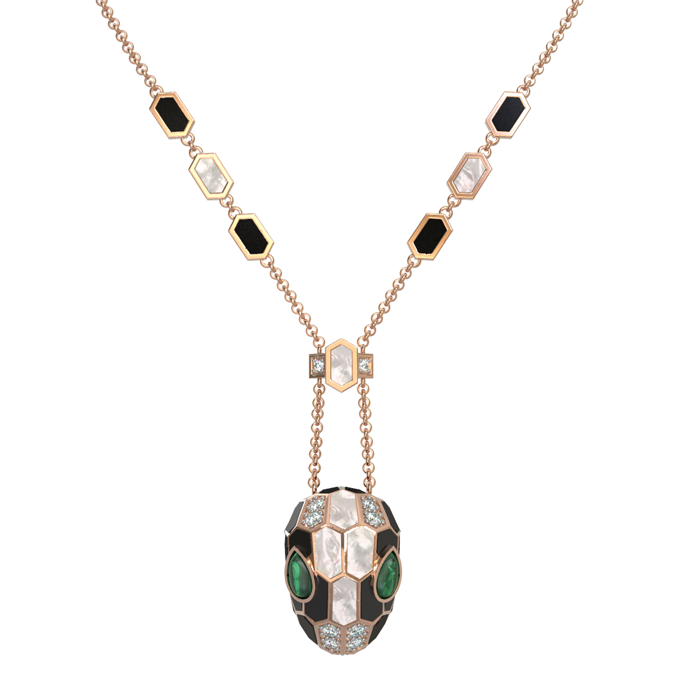 Колье из золота c бриллиантами, рубином, ониксом, малахитом и перламутром