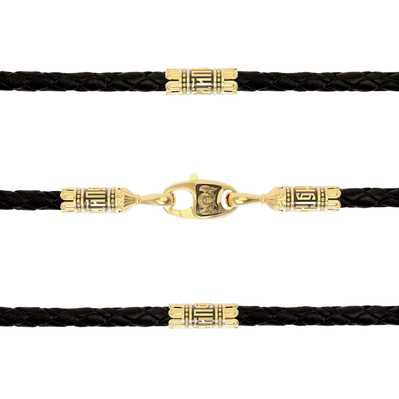 На шнурке цепи-шнурка расположены вставки, а на концах концевики с надписью: «Спаси и сохрани». Соединяет концевики замочек-карабин в форме рыбки. На замочке изображен шестикрылый Серафим.