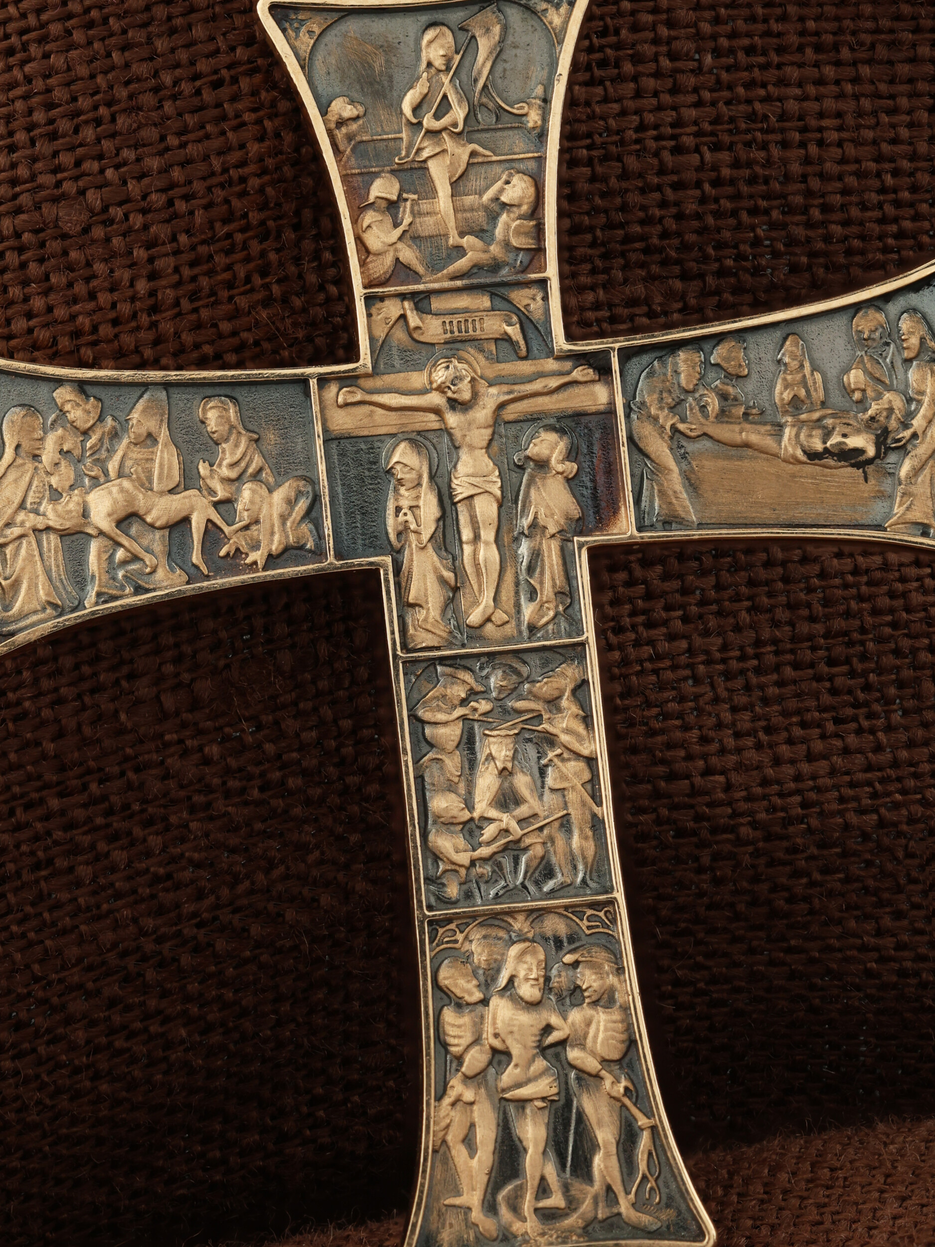 На лицевой стороне креста изображены Крестные Страдания и Воскресение Господа и Спасителя нашего Иисуса Христа. Крест- символ спасения и искупления рода человеческого, знамение победы над смертью и адом. Иисус Христос, как искупительная жертва освобождения человечества от власти греха, умер крестной смертью и в третий день воскрес. В центре креста изображено Распятие Иисуса Христа на Кресте. Ниже — взятие под стражу, а также пытки и мучения Христа перед Распятием. Слева от Распятия изображено снятие Господа с Креста, справа — положение во гроб. Над Распятием отображен образ Воскресшего из гроба Господа и Спасителя нашего Иисуса Христа.