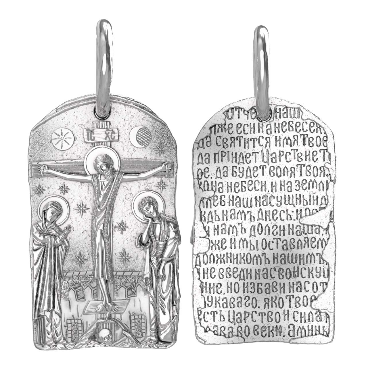 На лицевой стороне образка изображено Распятие Господа и Спасителя нашего Иисуса Христа. Своими крестными страданиями Господь смыл наши грехи, покрыл наш долг перед Богом. В Голгофе сокрыта непостижимая тайна бесконечной правды и любви Бога. Крест стал символом победы добра над злом, жизни над смертью, напоминанием бесконечной Божьей любви, предметом радости. Воплотившийся Сын Божий Своею кровью освятил крест и сделал его проводником Своей благодати, источником освящения верующих. На верхней табличке, выше головы Иисуса, написано сокращенно имя Спасителя «IC» «XC» — Иисус Христос. Слева от Распятия стоят оплакивающие Господа Пресвятая Богородица, справа — апостол и евангелист Иоанн Богослов, один из ближайших учеников Иисуса Христа. По преданию, увидя, что они горько плачут, Иисус сказал Матери Своей: «Жено! Се сын Твой!» Потом сказал ученику Иоанну: «Се мати твоя». С этого времени Иоанн взял Матерь Божию к себе, и Она жила в его доме до самой смерти.