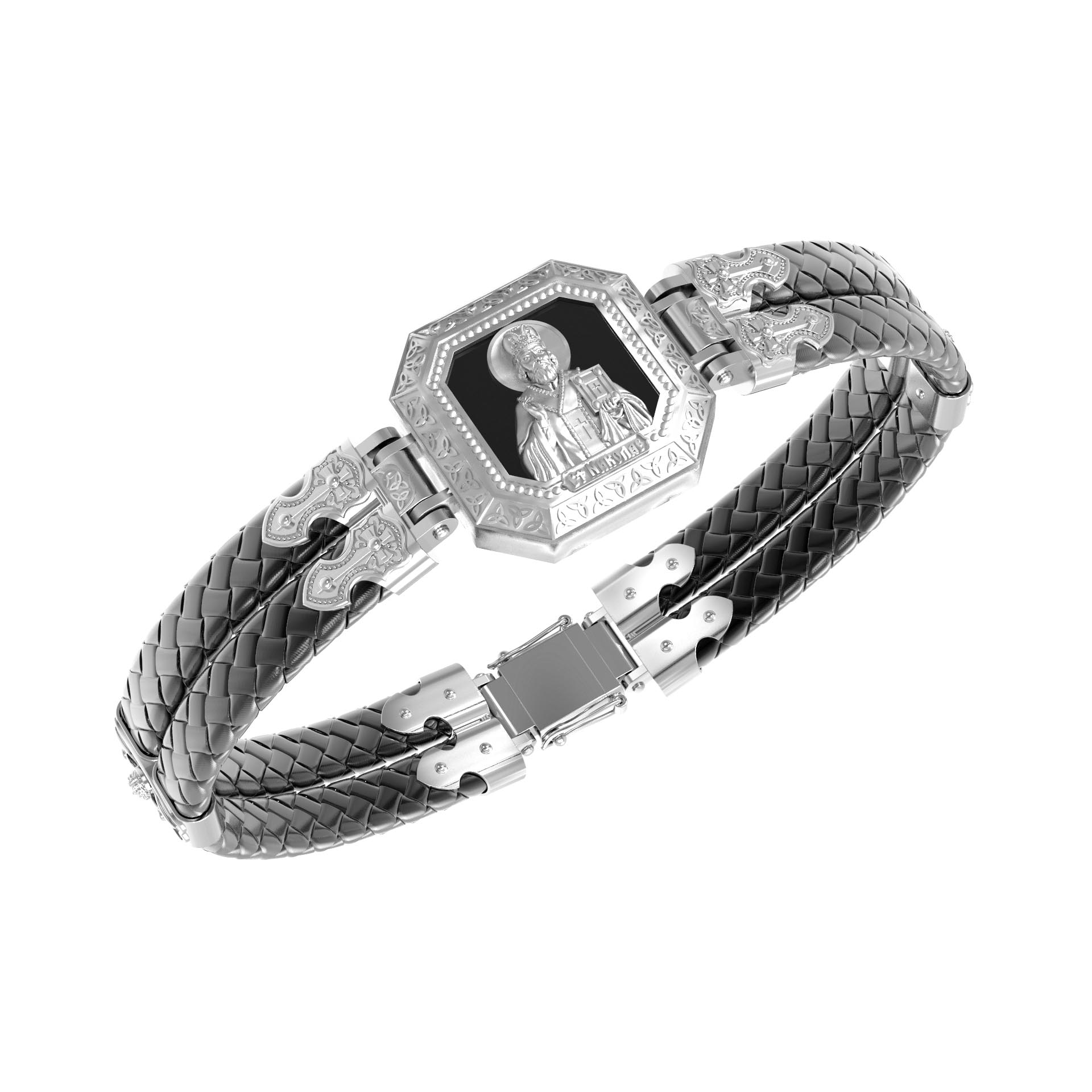 Лицевую сторону основного звена возглавляет икона Святителя Николая Чудотворца. Живший в III веке епископ Ликийского города Миры — самый почитаемый святой не только в России, но и во всем мире. Николай Чудотворец, помощник в делах, покровитель учащихся, утешитель обиженных и нуждающихся, целитель самых страшных и тяжелых недугов, предстатель и молитвенник за людей перед Богом. Также Святитель Николай Чудотворец известен своими молитвами за путешественников, когда непрестанный ветер и бушующие волны утихают и корабль заходит в спокойную гавань.