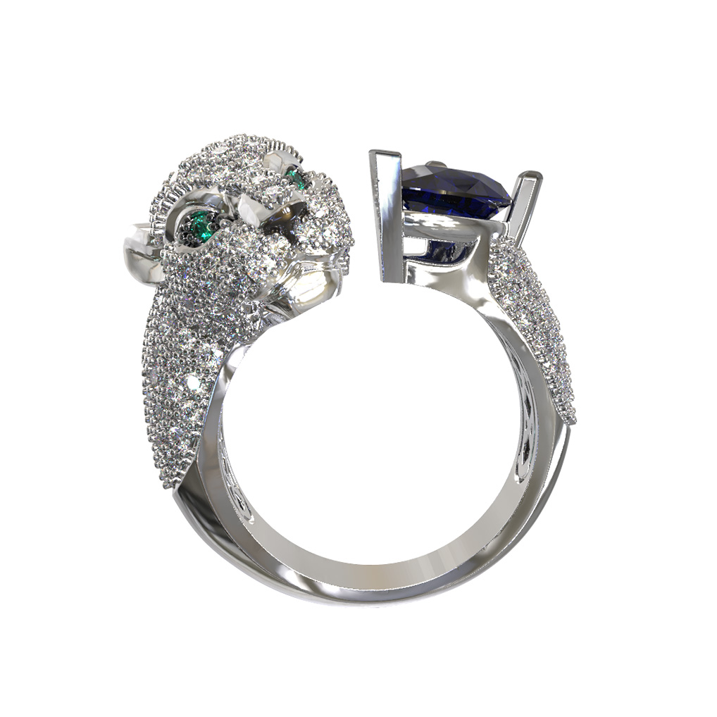 Кольцо из белого золота c бриллиантами, сапфиром и изумрудом