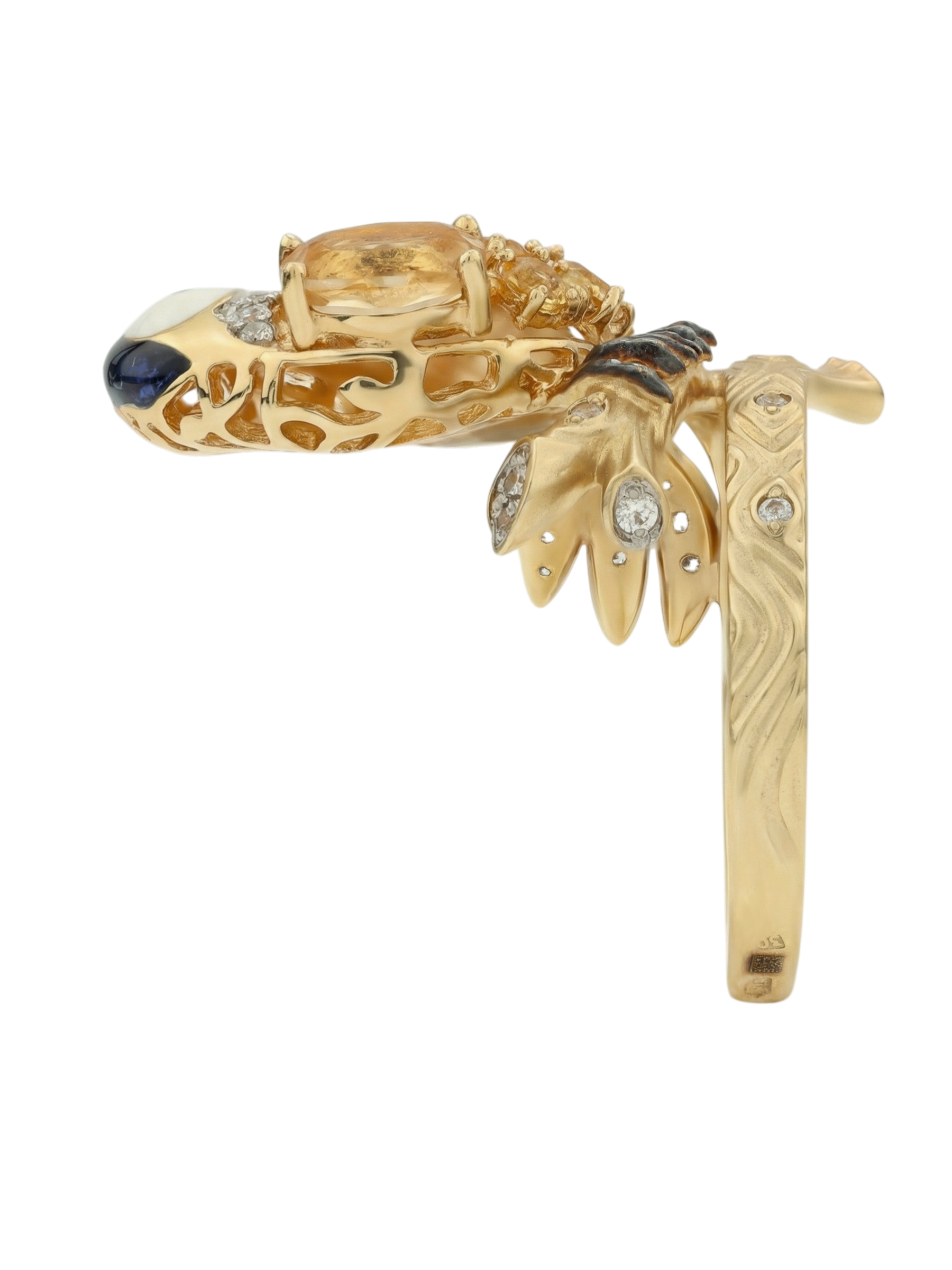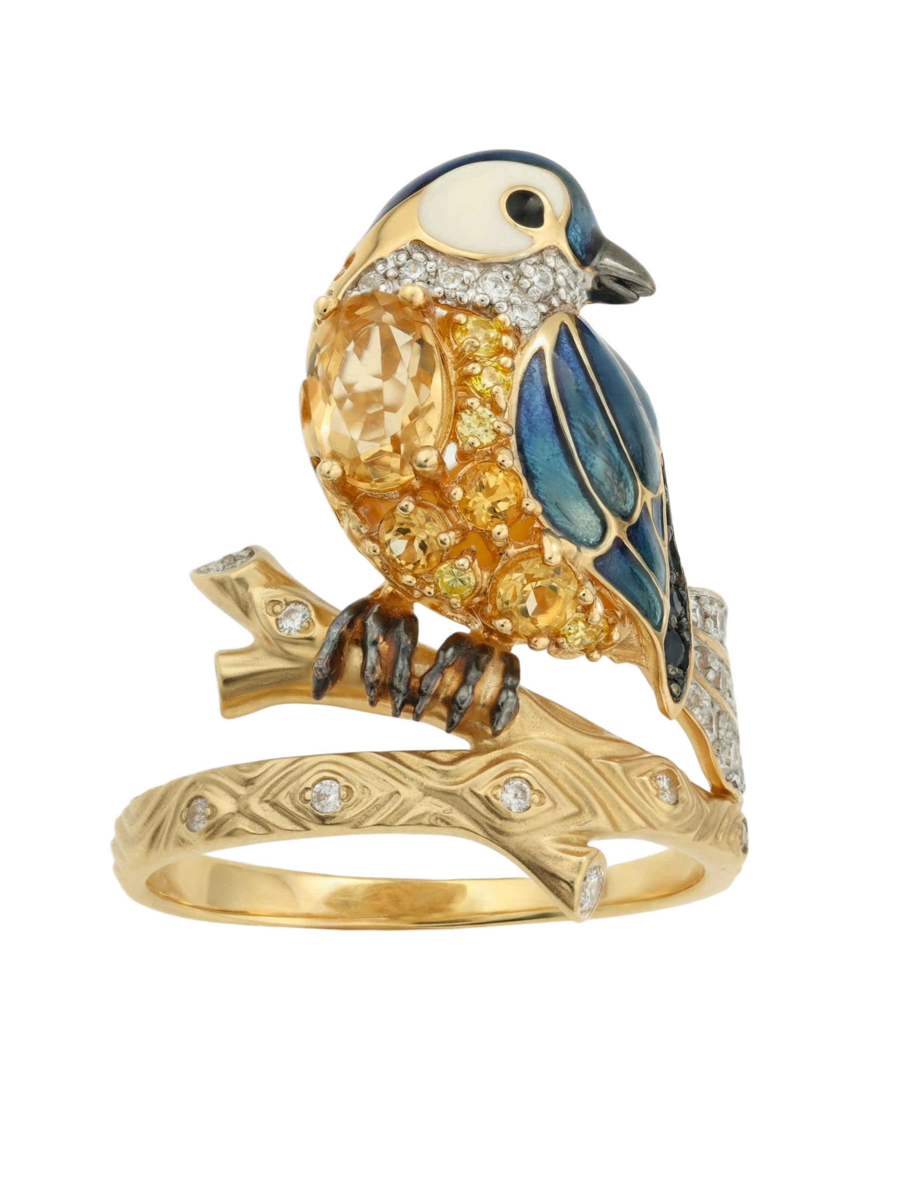 Кольцо из лимонного золота c эмаль, фианитом, цитрином и сапфиром