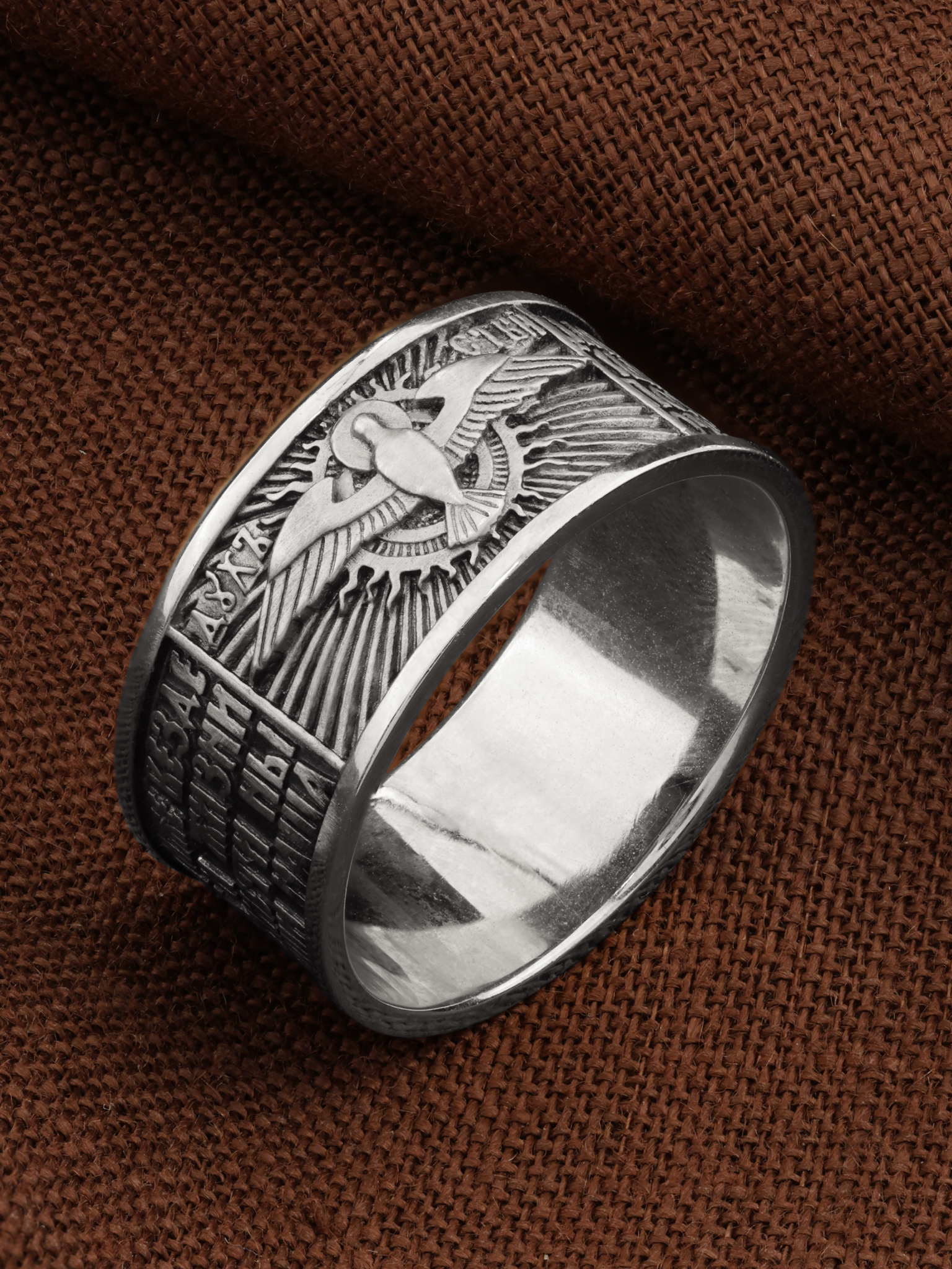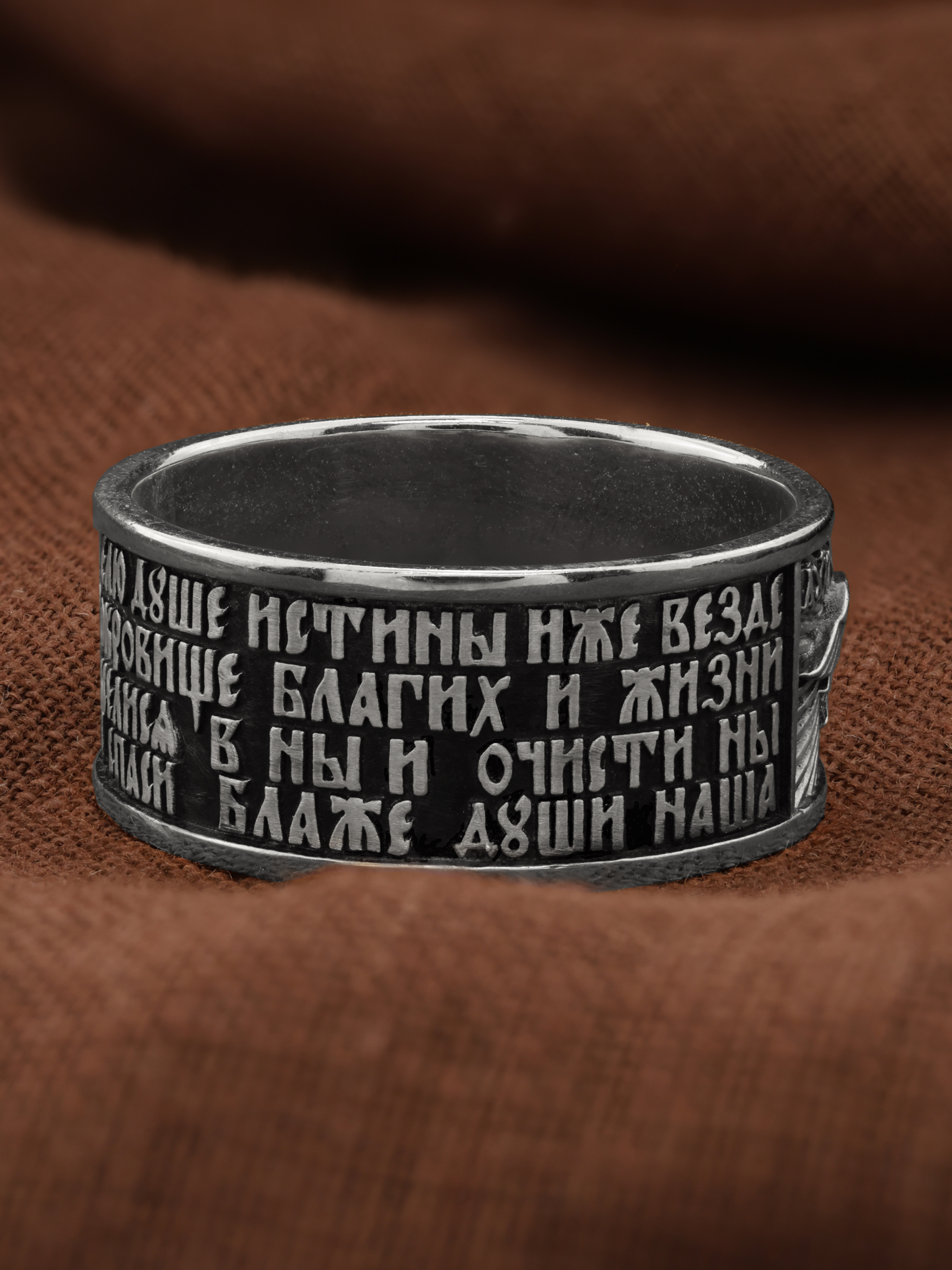 На лицевой стороне кольца изображен Святой Дух в виде голубя и помещена молитва Святому Духу: «Царю Небесный, Утешителю, Душе истины, Иже везде сый и вся исполняяй, Сокровище благих и жизни Подателю, прииди и вселися в ны, и очисти ны от всякия скверны, и спаси, Блаже, души наша».