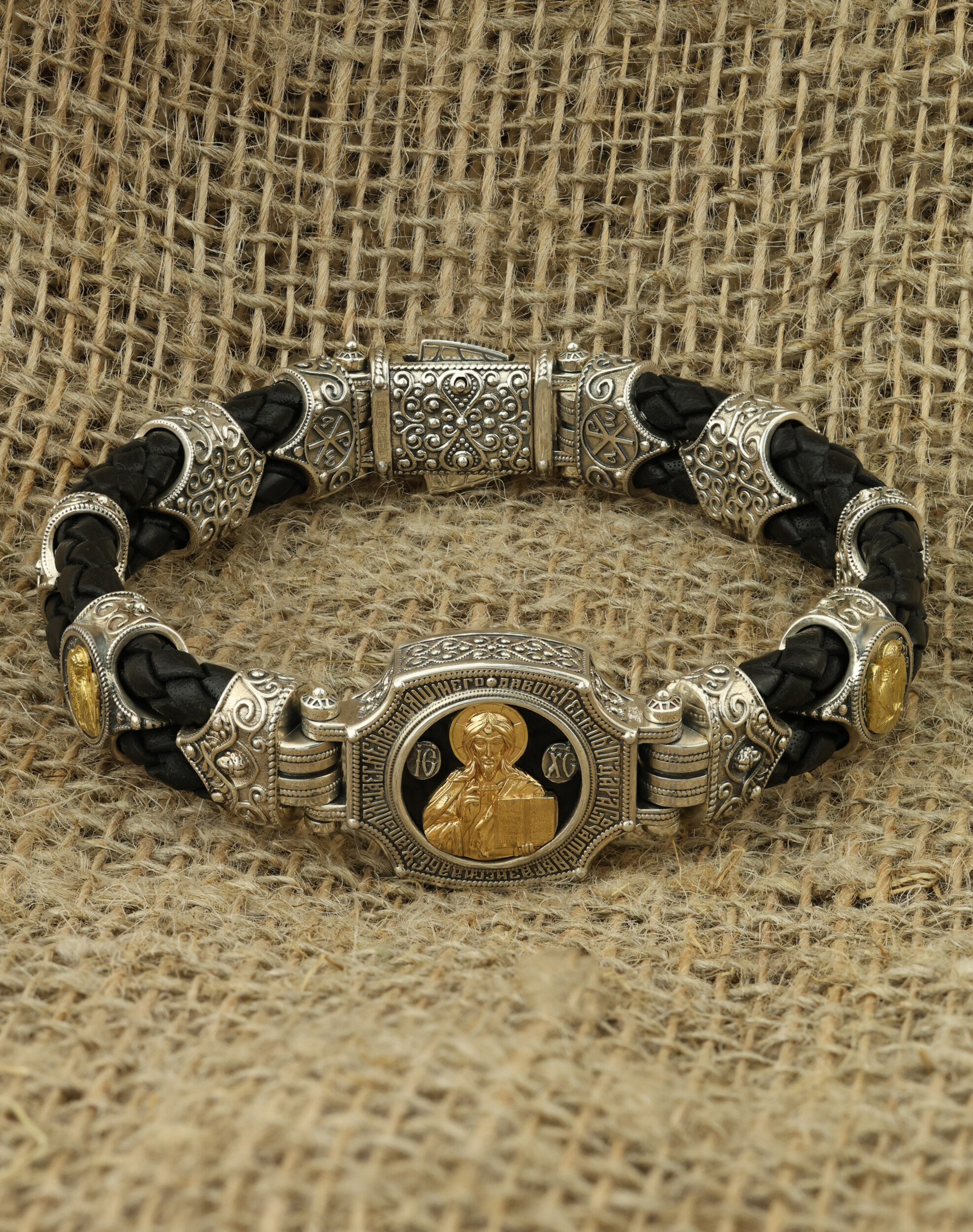 Браслет из серебра и золота c кожаным шнурком и ониксом