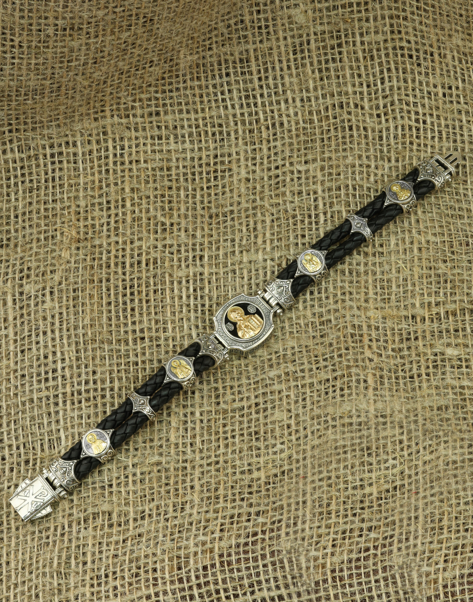 Браслет из серебра и золота c кожаным шнурком и ониксом
