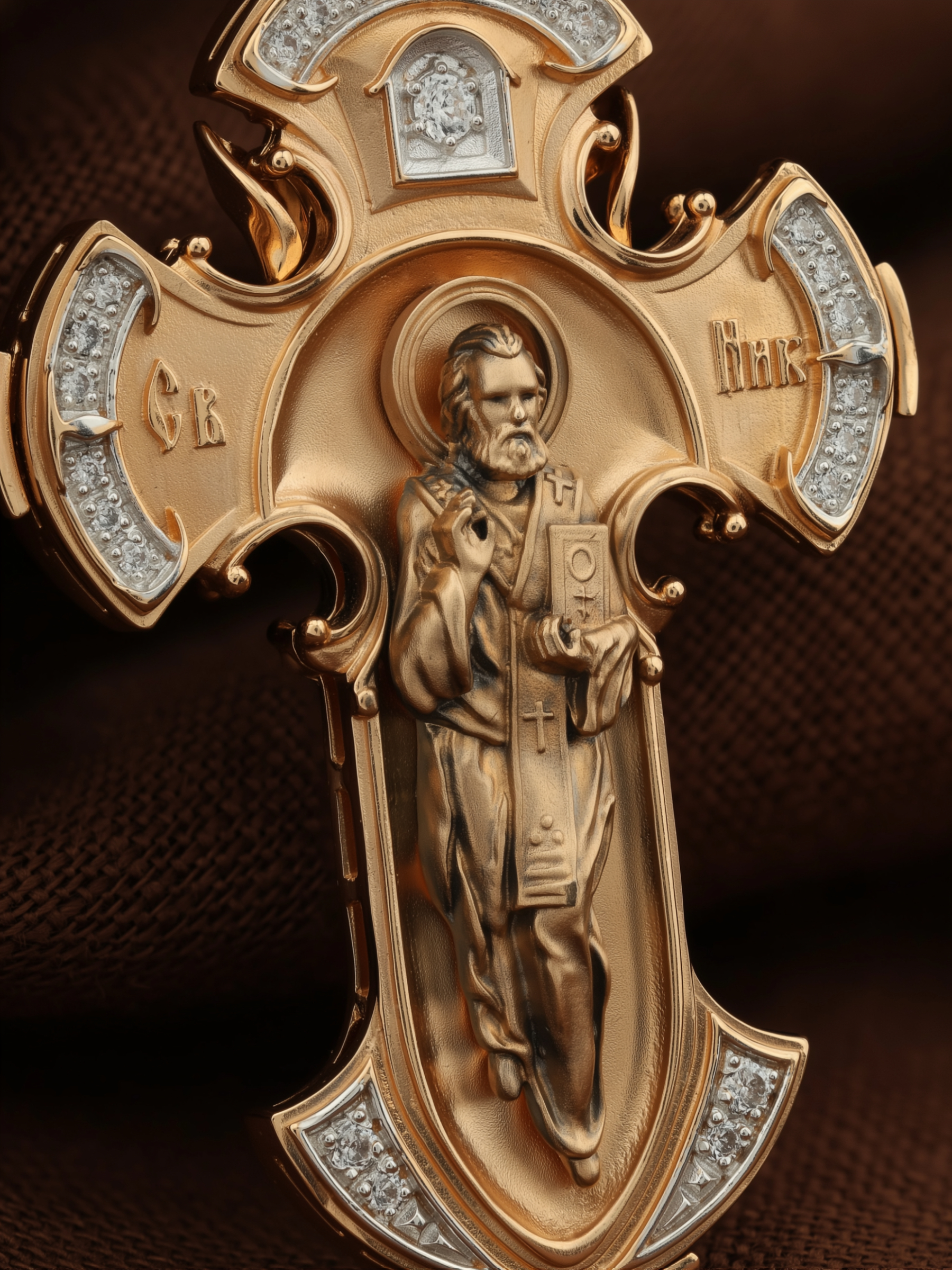 Оборотную сторону креста возглавляет икона святителя Николая Чудотворца. На кулонном кольце помещено изображение Спаса Нерукотворного — образ Спасителя, который Он запечатлел на плате и передал для исцеления больному проказой царю Эдессы. ему придается победное и защитное значение.