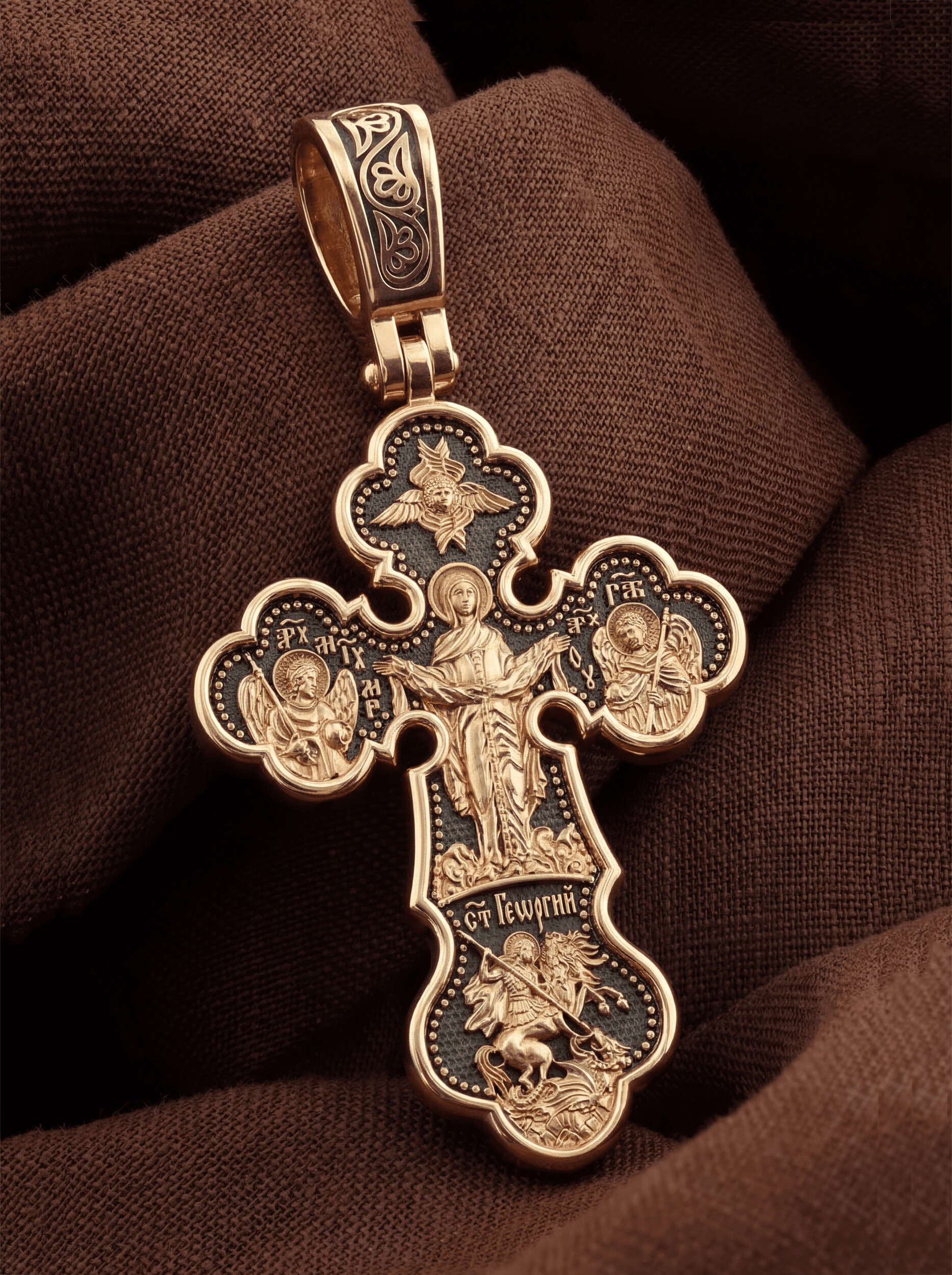 Центральную часть оборотной стороны креста украшает икона Божией Матери «Покров Пресвятой Богородицы». Праздник Покрова Пресвятой Богородицы пришел на Русь в XII веке из Византии и стал одним из самых почитаемых. Пресвятая Богородица простирает Свой молитвенный покров над всеми православными христианами и умоляет Сына своего о даровании вечного спасения каждому человеку. Над образом помещен шестикрылый Серафим. Справа помещено изображение Архангела Гавриила, слева- Архангела Михаила. На кресте внизу помещено изображение Святого Великомученика Георгия Победоносца — одного из самых почитаемых и удивительных святых. Он изображен как воитель, сидящий на вздыбленном коне и поражающий копьем огнедышащего змея. Змей символизирует собою сатанинские силы.