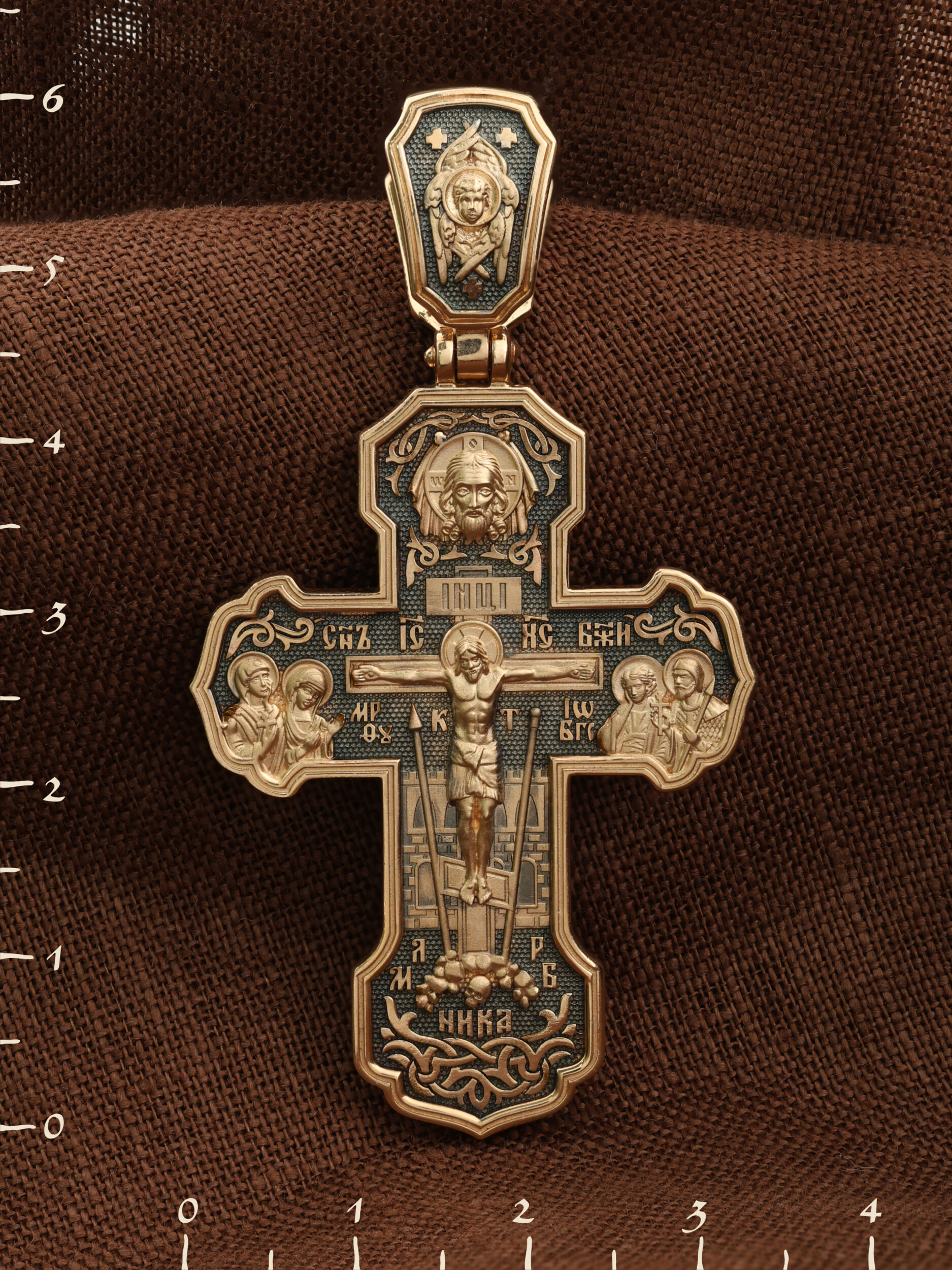 На лицевой стороне креста изображено Распятие Господа и Спасителя нашего Иисуса Христа. Крест- символ спасения и искупления рода человеческого, знамение победы над смертью и адом. Иисус Христос, как искупительная жертва освобождения человечества от власти греха, умер крестной смертью и в третий день воскрес. На верхней табличке, выше головы Иисуса, расположена надпись, составленная Понтием Пилатом — «IНЦI». Она означает «Иисус Назорей, Царь Иудейский». Надпись «IС» « ХС» означает Иисус Христос и помещается на разных сторонах поперечной (большой) перекладины креста. Рядом расположена надпись «Сын Божий». Выше Распятия изображен Нерукотворный образ Господа и Спасителя нашего Иисуса Христа. Слева от Распятия — Пресвятая Богородица и святая мироносица Мария Магдалина с крестом в руке. Справа — апостол и евангелист Иоанн Богослов, один из ближайших учеников Иисуса Христа и сотник Лонгин с крестом в правой руке и копьем — в левой. За крестом высится Иерусалимская стена. Крест стоит на горе камней, символизирующих Голгофу. В ее основании различается череп — это голова Адама. Вдоль креста изображены копие сотника Лонгина и трость с губкой и буквы «К» и «Т». Надпись «МЛРБ» — «место лобное рай бысть» означает, что место лобное стало раем и помещаются в нижней части креста. Рядом — слово «НИКА», что означает «победитель». На православном кресте Христос не умирает, а свободно простирает руки, ладони Иисуса открыты, будто он хочет обнять все человечество, даря им свою любовь и открывая путь к вечной жизни. На кулонном кольце изображен шестикрылый Серафим.