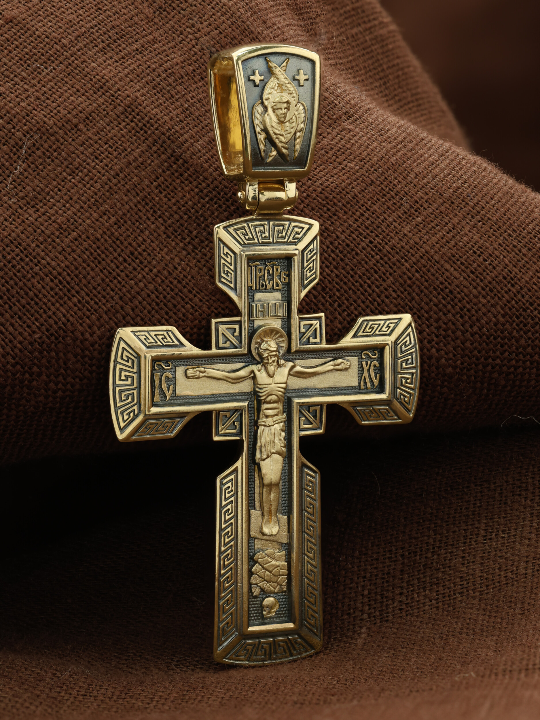 На его лицевой стороне изображено Распятие Господне на восьмиконечном Голгофском кресте. Над головой Спасителя на поперечной перекладине помещена надпись «IНЦI», которая является сокращенным выражением титла, установленного на Кресте Понтием Пилатом: «Иисус Назорей Царь Иудейский». На боковых оконечностях креста вписаны инициалы святого имени Христа «IС ХС». В верхней оконечности креста имеется монограмма «Царь Славы», которая гласит о том, что Христос — Великий Архиерей, Царь и Жертвенный Агнец, искупивший грехи мира. У подножия креста в виде каменистого пригорка изображена гора Голгофа с Главой Адамовой в пещере.