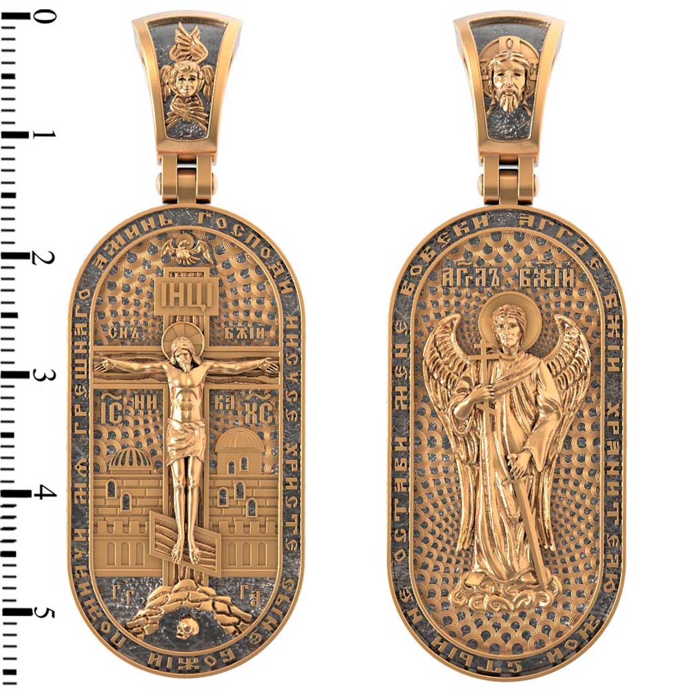 Центральную часть лицевой стороны занимает Распятие Христа — образ жертвы, принесенной Господом за грехи людей. Именно ко Христу, сошедшему на землю ради нашего спасения, возносятся все молитвы. Рядом с Его образом помещены слова — «НИКА» (греч. — Победитель) и «СЫН БОЖИЙ». Эти слова характеризуют Господа как Великого Архиерея, победителя смерти. Также Распятие сопровождается надписями, олицетворяющими Христа — это святое имя Христа «IC» (Иисус) «ХС» (Христос). Верхняя перекладина символизирует собой табличку с надписью «IHЦI» — Иисус Назарянин Царь Иудейский. Возвышение, на котором стоит Крест, символизирует гору Голгофу, на которой произошло Распятие. У подножия Креста изображают прах Адама, обозначенный черепом. На кулонном кольце изображен шестикрылый Серафим — самый приближенный к Господу Ангел. По контуру образка написана молитва: «Господи Иисусе Христе, Сыне Божий, помилуй мя грешного. Аминь»