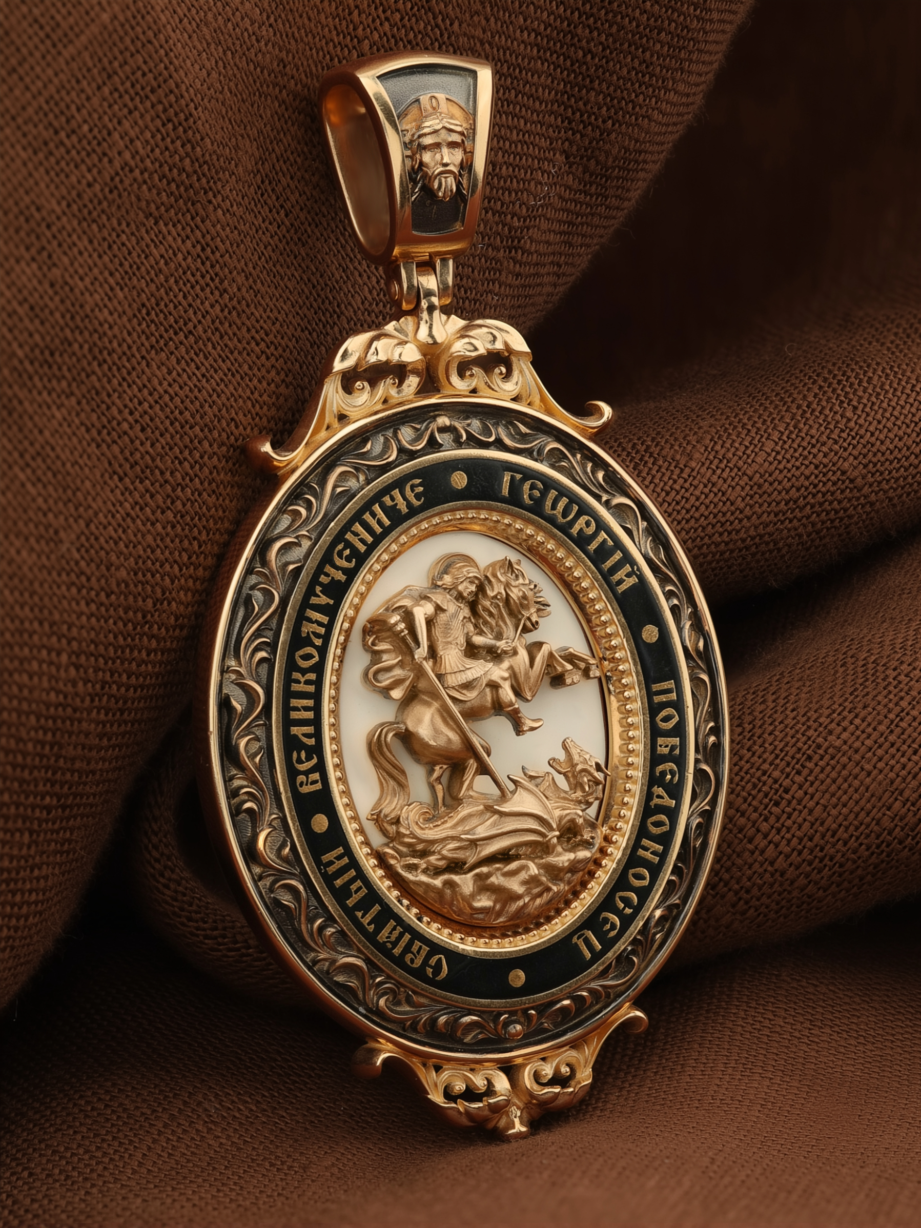 Молитва перед иконой Георгия Победоносца поможет защититься от врагов, одержать победу в сражении (военном, спортивном, духовной брани с дьяволом), содействие в установлении мира между членами семьи, избавиться от телесного недуга. На кулонном кольце изображен Спас Нерукотворный — Символ вочеловечившегося Божества и шестикрылый Серафим — самый приближенный к Господу Ангел.