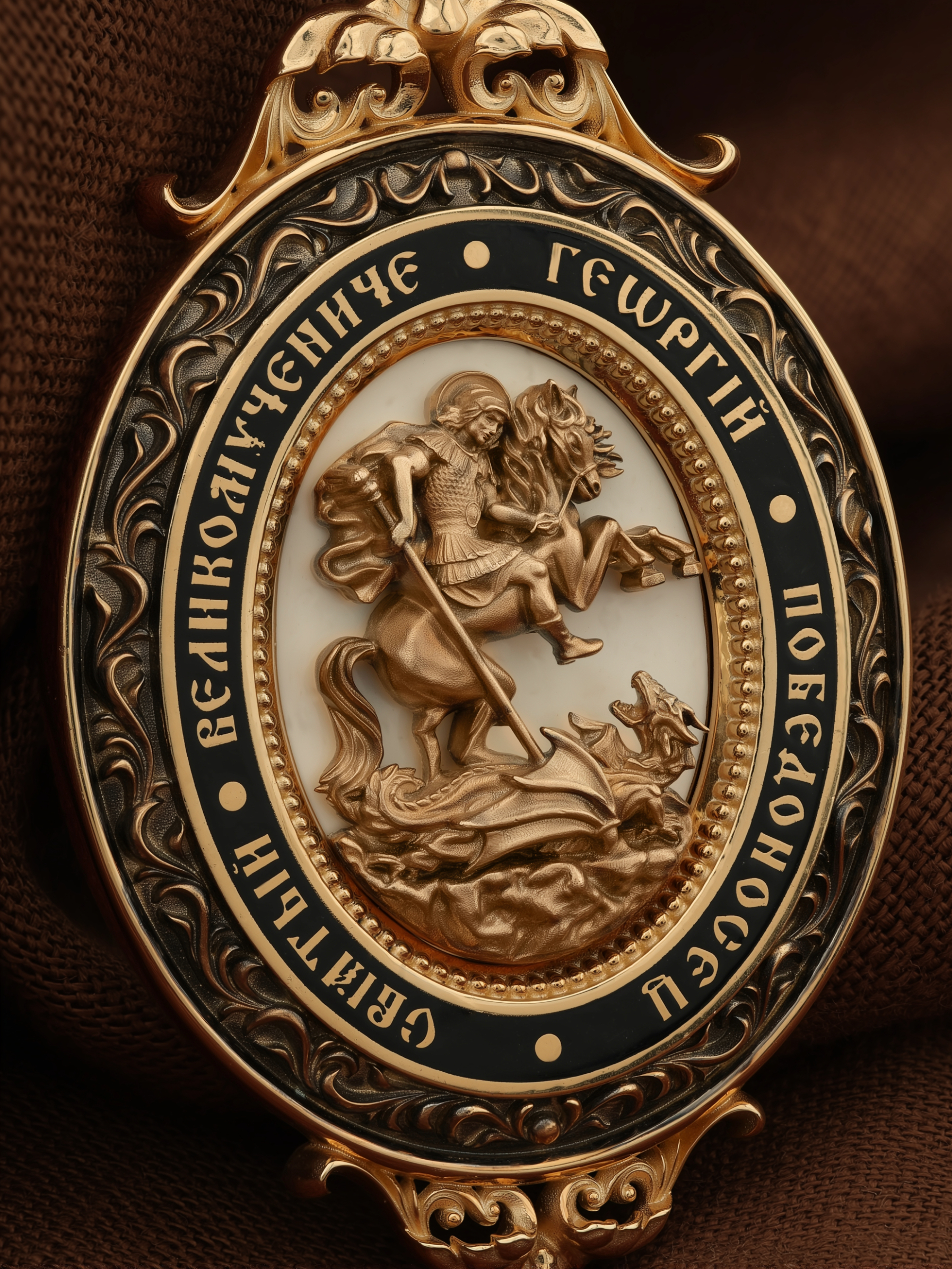 Основой композиции лицевой стороны является изображение Святого Георгия Победоносца. Образ Великомученика считают одним из наиболее чтимых святынь в Святыни Православных, он олицетворяет собой заступника для верующих, чья жизнь имеет какое-либо отношение к военным делам, также он может оберегать и землевладельцев. Одно из самых великих чудес которое сотворил Великомученик так это — спасения всего города от устрашающего змия. Молитвами и своей непреклонной верой, взываемой к Всевышнему, он смог одолеть чудовище. Святой убил змея, спас жителей и их души от влияния дьявола, породив в них надежду и веру в Господа, призывая людей принять христианскую веру.