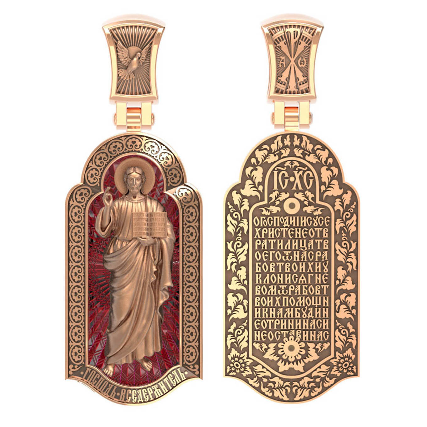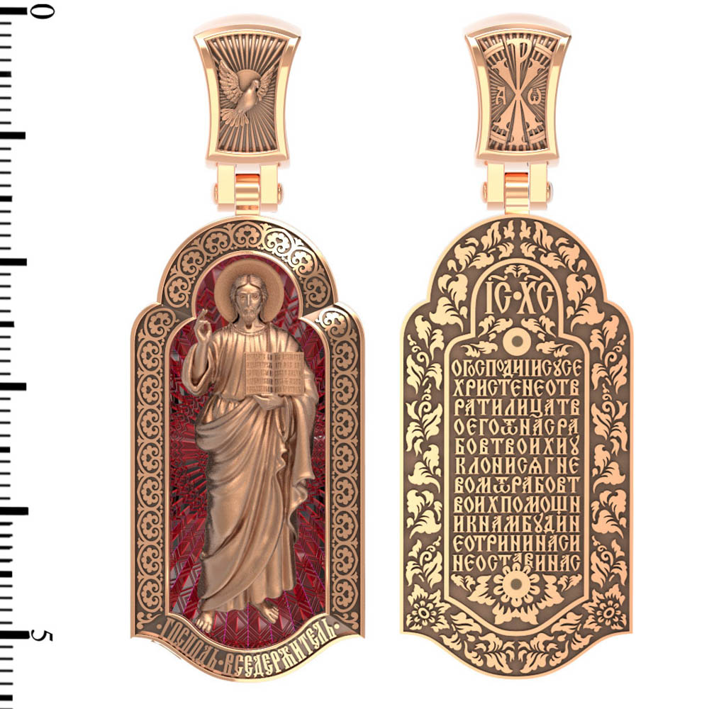 На лицевой стороне креста изображен Иисус Христос в образе Вседержителя, по-гречески «Пантократор». Это древнейший образ Спасителя, на котором Он представлен как властелин и правитель мира. Христос держит в руках Книгу, которая символизирует Книгу Бытия, то есть весь сотворенный Богом мир. В этой Книге судьбы всех людей, живущих на земле. Часто эту Книгу образно называют Книгой Жизни. Первое дошедшее до нас подобное изображение датируется VI веком и хранится в монастыре Святой Екатерины на горе Синай. Такие образы Христа с глубокой древности писались и в Палестине. Но Святая земля так часто подвергалась разграблению завоевателями, что древних икон там не осталось. Большинствоикон в храме Воскресения Христова были созданыв XIX веке.