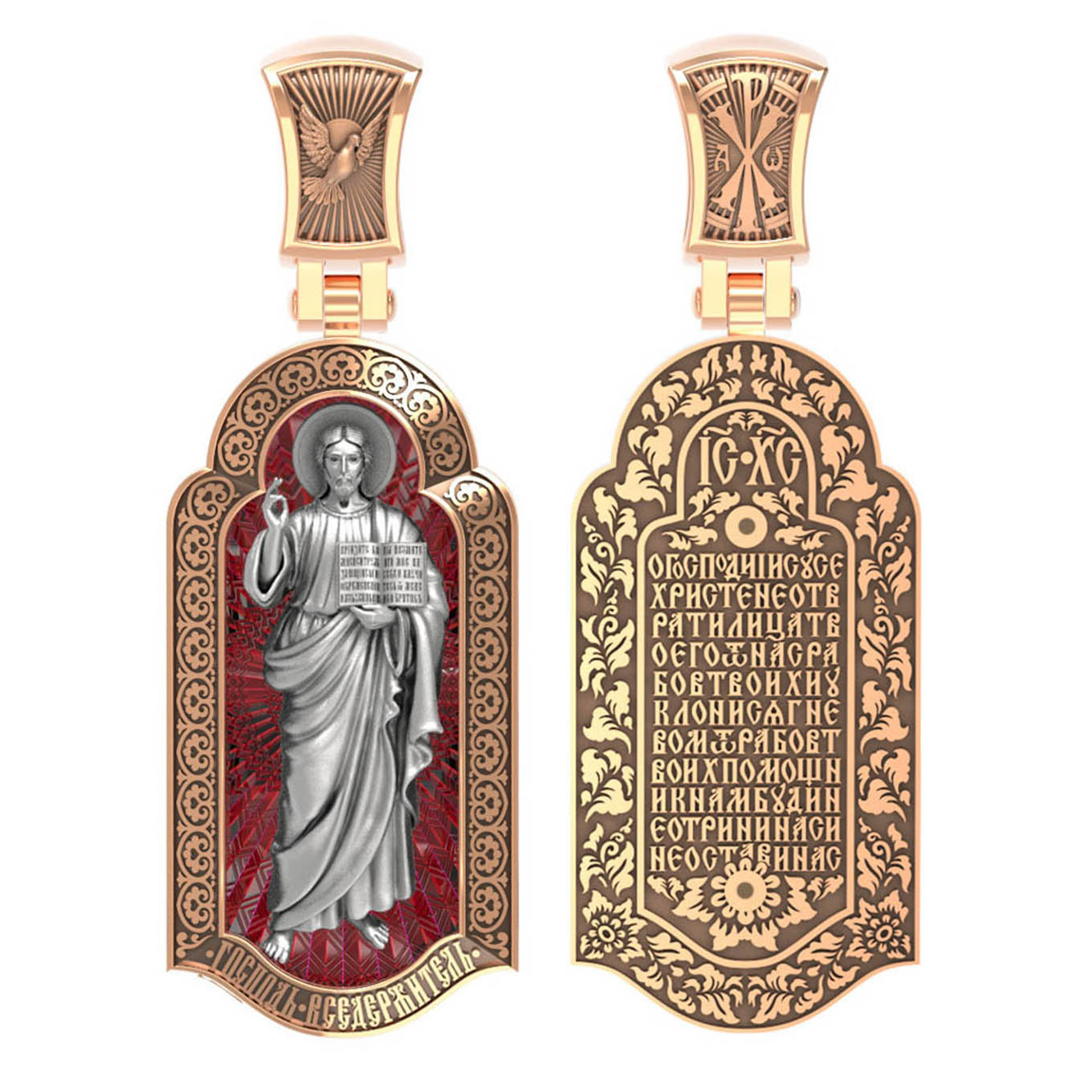 На лицевой стороне креста изображен Иисус Христос в образе Вседержителя, по-гречески «Пантократор». Это древнейший образ Спасителя, на котором Он представлен как властелин и правитель мира. Христос держит в руках Книгу, которая символизирует Книгу Бытия, то есть весь сотворенный Богом мир. В этой Книге судьбы всех людей, живущих на земле. Часто эту Книгу образно называют Книгой Жизни. Первое дошедшее до нас подобное изображение датируется VI веком и хранится в монастыре Святой Екатерины на горе Синай. Такие образы Христа с глубокой древности писались и в Палестине. Но Святая земля так часто подвергалась разграблению завоевателями, что древних икон там не осталось. Большинствоикон в храме Воскресения Христова были созданыв XIX веке.