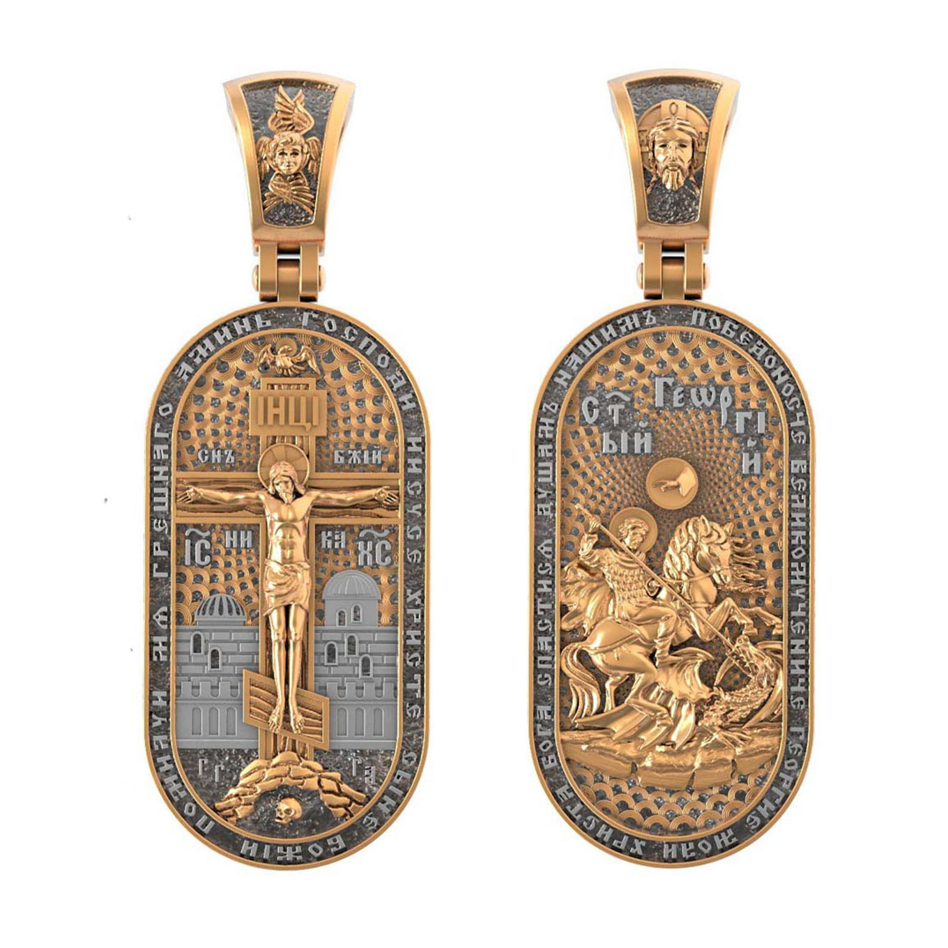 По контуру написана молитва: «Победоносче Великомучениче Георгие, моли Христа Бога спастися душам нашим». На кулонном кольце изображен Спас Нерукотворный — Символ вочеловечившегося Божества.