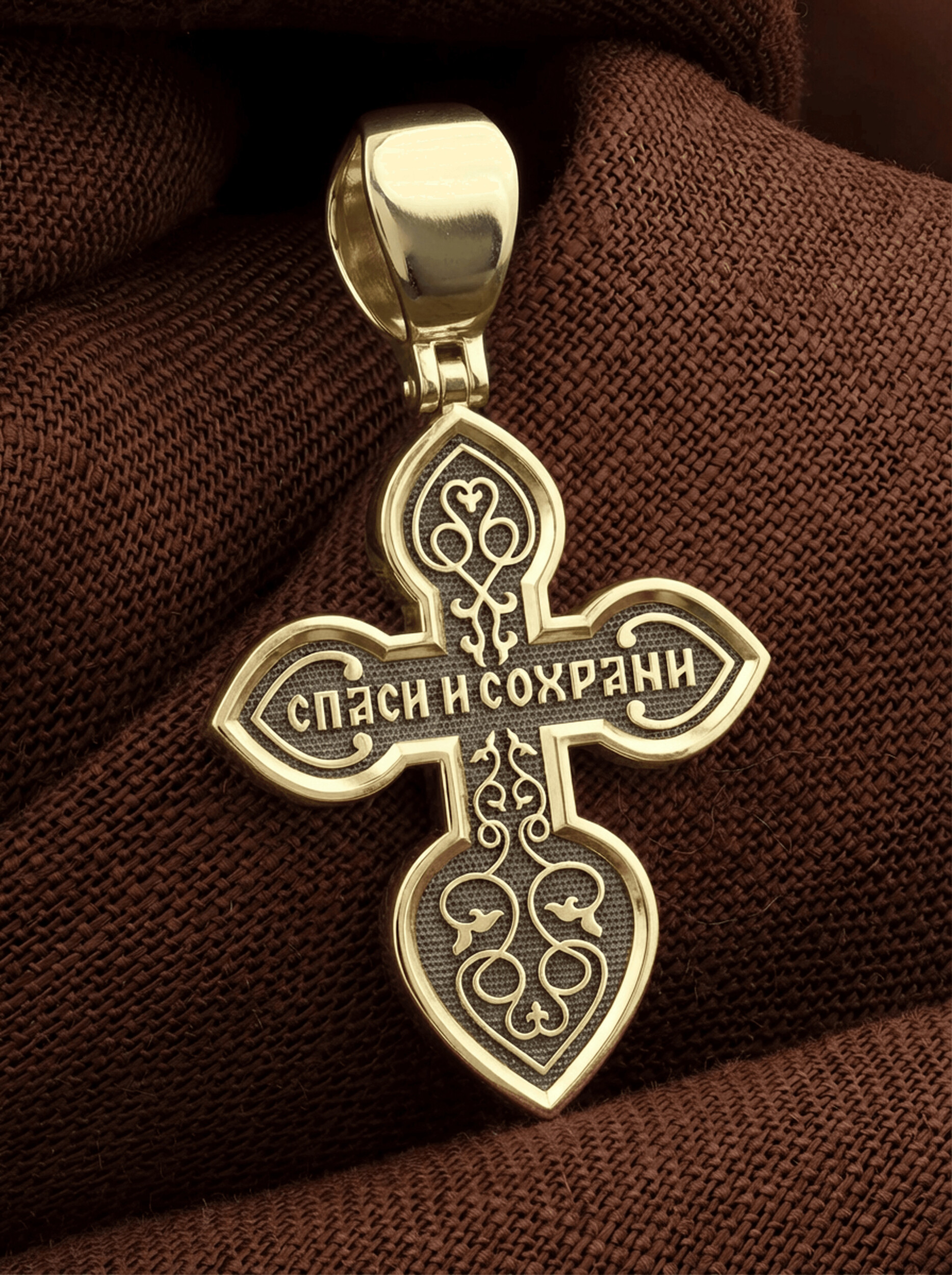 На обороте данного креста, в окружении изящного растительного узора, написано молитвенное славословие: «Спаси и сохрани».