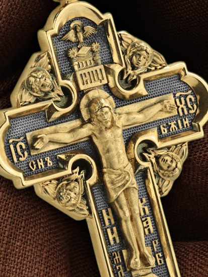 На лицевой стороне креста изображено Распятие Господа и Спасителя нашего Иисуса Христа, отдавшего Себя на смерть, чтобы другие могли жить — жить вечной жизнью, жить с Богом. Своею кровью Господь освятил крест и сделал его проводником Своей благодати, источником освящения верующих. На верхней табличке, выше головы Иисуса, расположена надпись, составленная Понтием Пилатом — «ИНЦИ». Она означает «Иисус Назорей, Царь Иудейский». Надпись «IС ХС» означает Иисус Христос помещается на разных сторонах поперечной (большой) перекладины креста. На кулонном кольце помещено изображение Духа Святого в виде голубя, сходящего с Небес