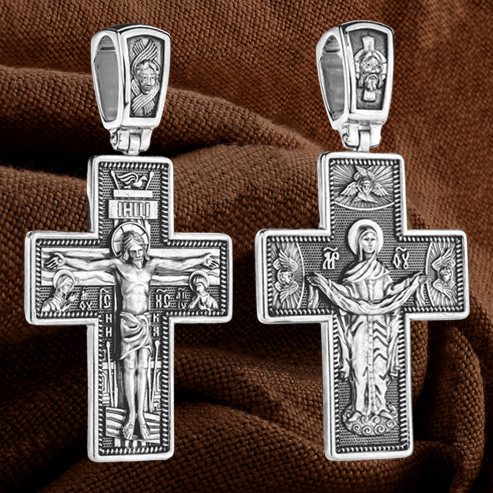 На обороте креста, в окружении крылатых Серафимов, изображена икона Покрова Пресвятой Богородицы. Праздник Покрова Божией Матери является воспоминанием чуда, которое произошло во Влахнернской церкви 1 (14) октября 910 года: Пресвятая Богородица явилась верующим над алтарем храма и распростерла над ними Свое покрывало. В этот день Божья Матерь открыла людям, что Она является Ходатаицей за них перед Богом. Богородица простирает Свой молитвенный покров над всеми православными христианами и умоляет Сына Своего о даровании вечного спасения каждому человеку.