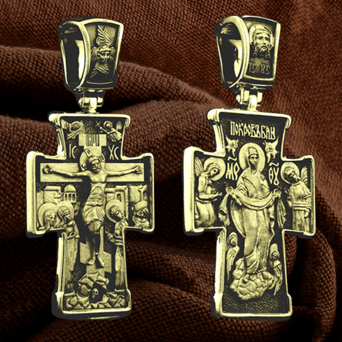 На обороте креста изображена икона Покрова Пресвятой Богородицы. Праздник Покрова Божией Матери является воспоминанием чуда, которое произошло во Влахнернской церкви 1 (14) октября 910 года: Пресвятая Богородица явилась верующим над алтарем храма и распростерла над ними Свое покрывало. В этот день Божия Матерь открыла людям, что Она является Ходатаицей за них перед Богом. Богородица простирает Свой молитвенный покров над всеми православными христианами и умоляет Сына Своего о даровании вечного спасения каждому человеку.