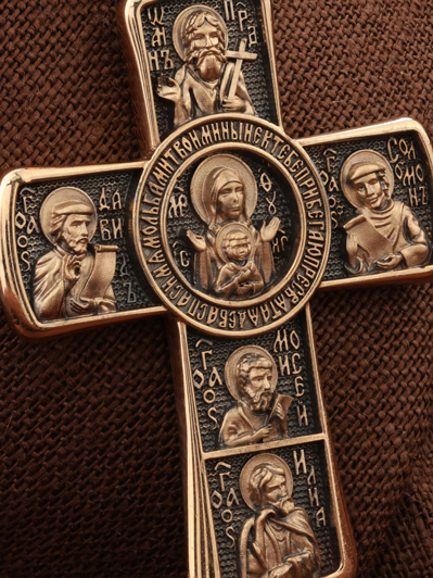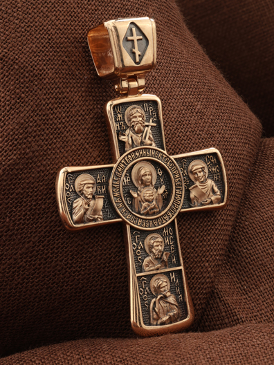 Центральную часть оборота креста украшает икона Божией Матери «Знамение». Вокруг Ее образа написана молитва: «Ныне к Тебе прибегаю, Пресвятая Дева, спаси мя мольбами Твоими».