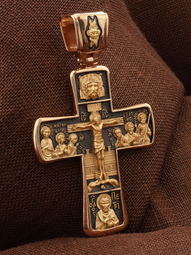На лицевой стороне креста изображено Распятие Господа Иисуса Христа с предстоящими Ему святыми, которые, по преданию, находились у Креста Господа во время Его казни. Слева — Пресвятая Богородица и жены-мироносицы — равноапостольная Мария Магдалина и святая Мария Клеопова, справа — апостол Иоанн Богослов, прав. Иосиф Аримофейский и мч. Лонгин Сотник.