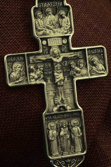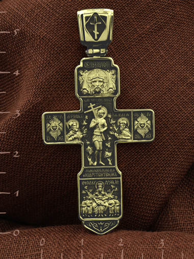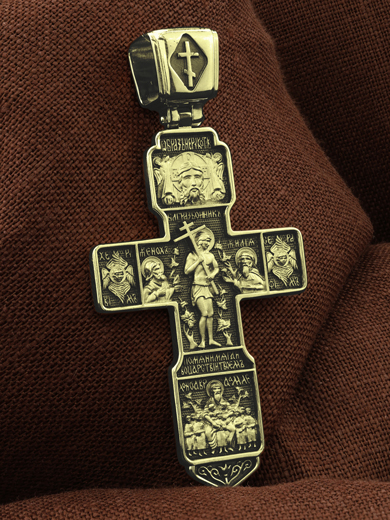 На концах горизонтальной балки креста помещены образы вселенских святителей и творцов литургии Василия Великого и Иоанна Златоуста. В кулонном кольце изображены райские врата с их стражем — Херувимом. Врата, которые открылись благодаря крестной жертве Христа.