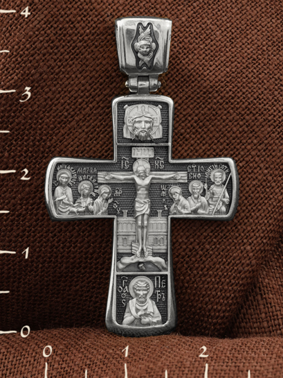 На лицевой стороне креста изображено Распятие Господа Иисуса Христа с предстоящими Ему святыми, которые, по преданию, находились у Креста Господа во время Его казни. Слева — Пресвятая Богородица и жены-мироносицы — равноапостольная Мария Магдалина и святая Мария Клеопова, справа — апостол Иоанн Богослов, прав. Иосиф Аримофейский и мч. Лонгин Сотник.