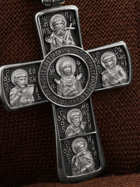 Центральную часть оборота креста украшает икона Божией Матери «Знамение». Вокруг Ее образа написана молитва: «Ныне к Тебе прибегаю, Пресвятая Дева, спаси мя мольбами Твоими».