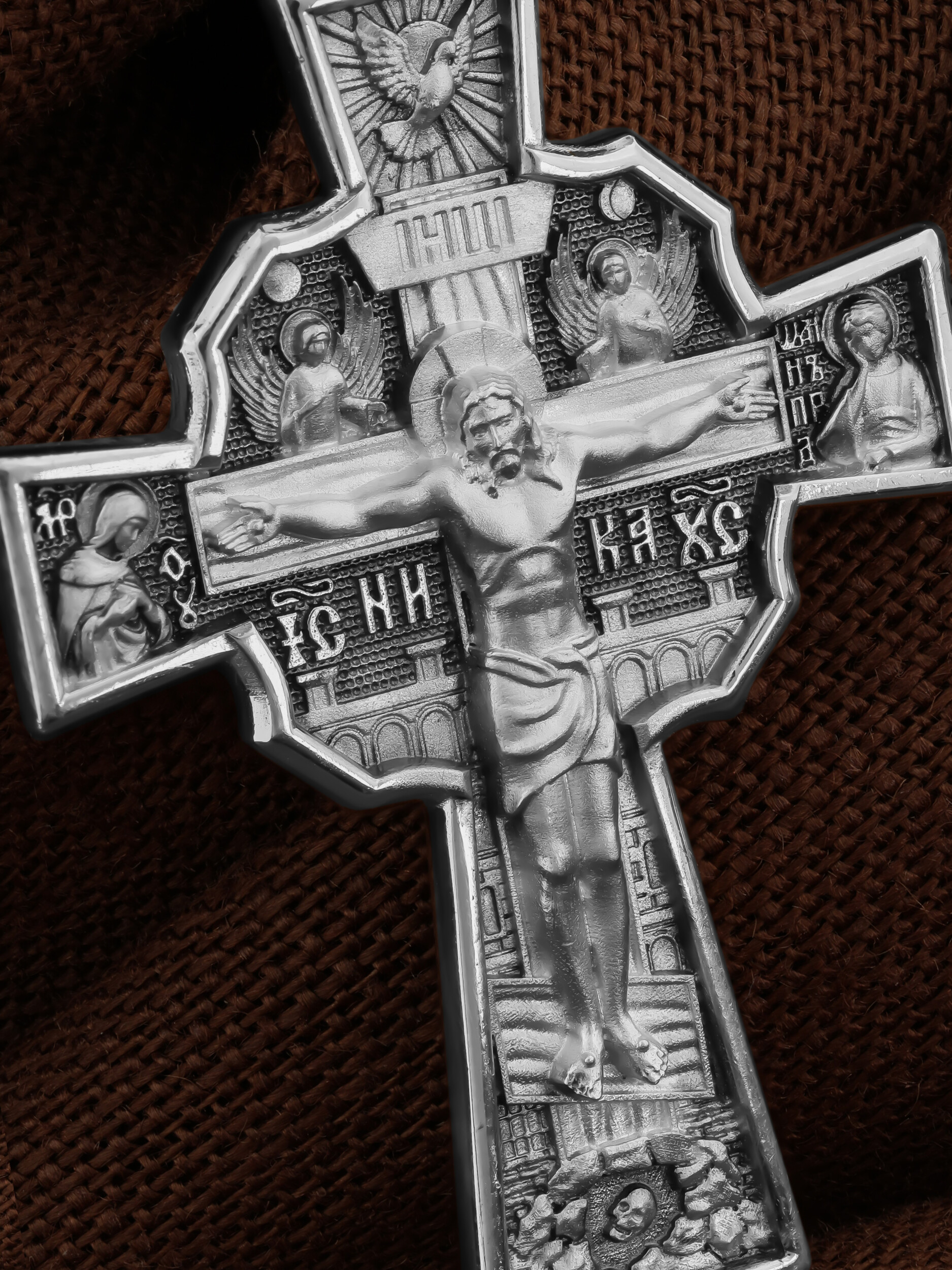 На лицевой стороне креста изображено Распятие Господа и Спасителя нашего Иисуса Христа, отдавшего Себя на смерть, для искупления грехов мира. Верхняя перекладина символизирует титло — табличку, на которой, согласно Евангелию, было начертано: Иисус Назорей Царь Иудейский (IНЦI). Распятие сопровождается надписями, олицетворяющими Христа. Надпись «IС» « ХС», что означает Иисус Христос, и слово «НИКА», что означает «победитель», помещаются ниже поперечной перекладины креста. Над вершиной Распятия помещено изображение Святого Духа, в виде голубя сходящего с небес, и двух Ангелов. Слева от Распятия изображена Пресвятая Богородица, справа — апостол и евангелист Иоанн Богослов, один из ближайших учеников Иисуса Христа. За крестом высится Иерусалимская стена, в знак того, что Господь был распят вне стен города. Возвышение, на котором стоит Крест, символизирует гору Голгофу, на которой произошло Распятие. Под подножием Креста изображена покоящаяся голова (череп) Адама. На кулонном кольце помещено изображение шестикрылого Серафим.