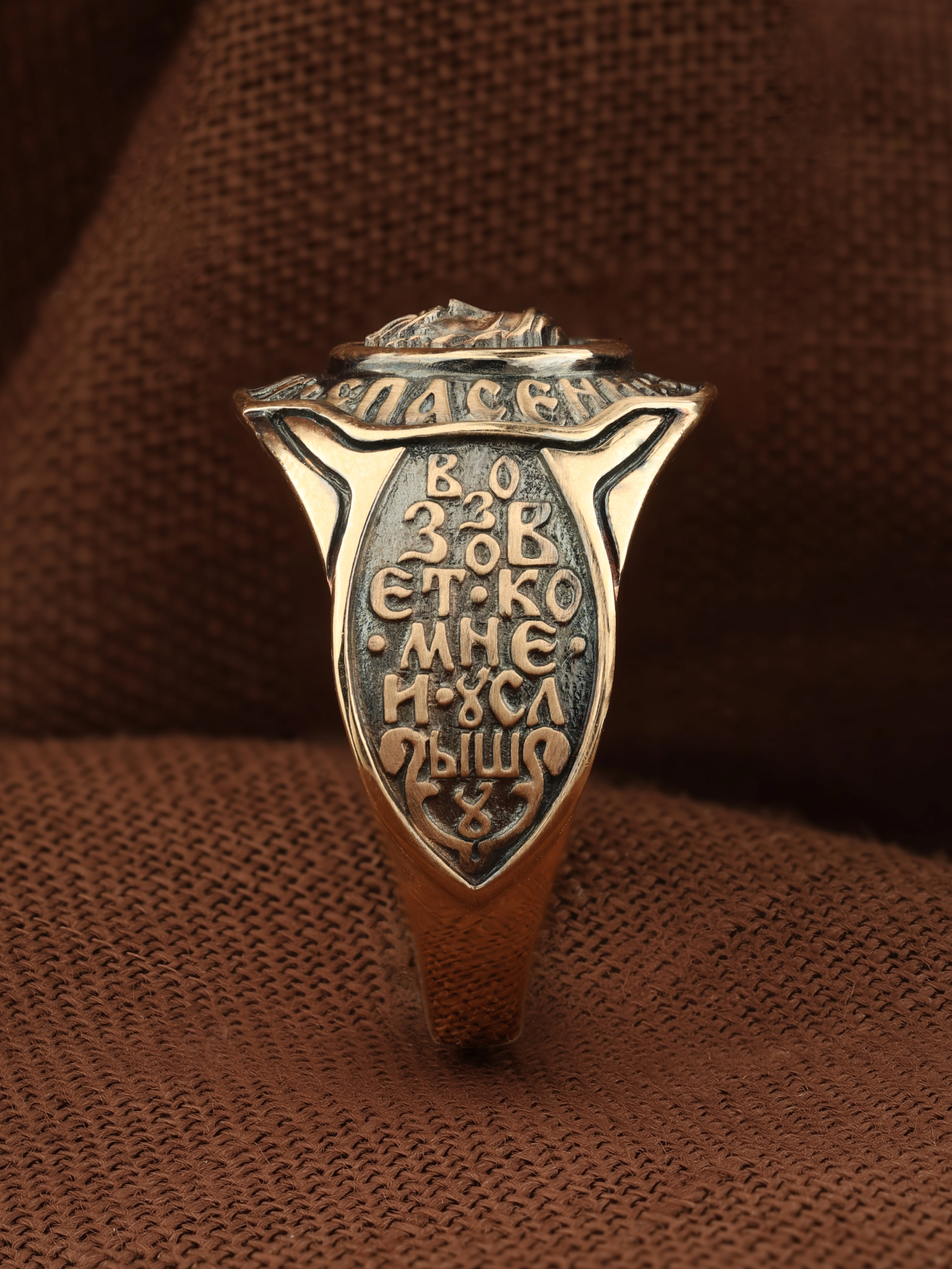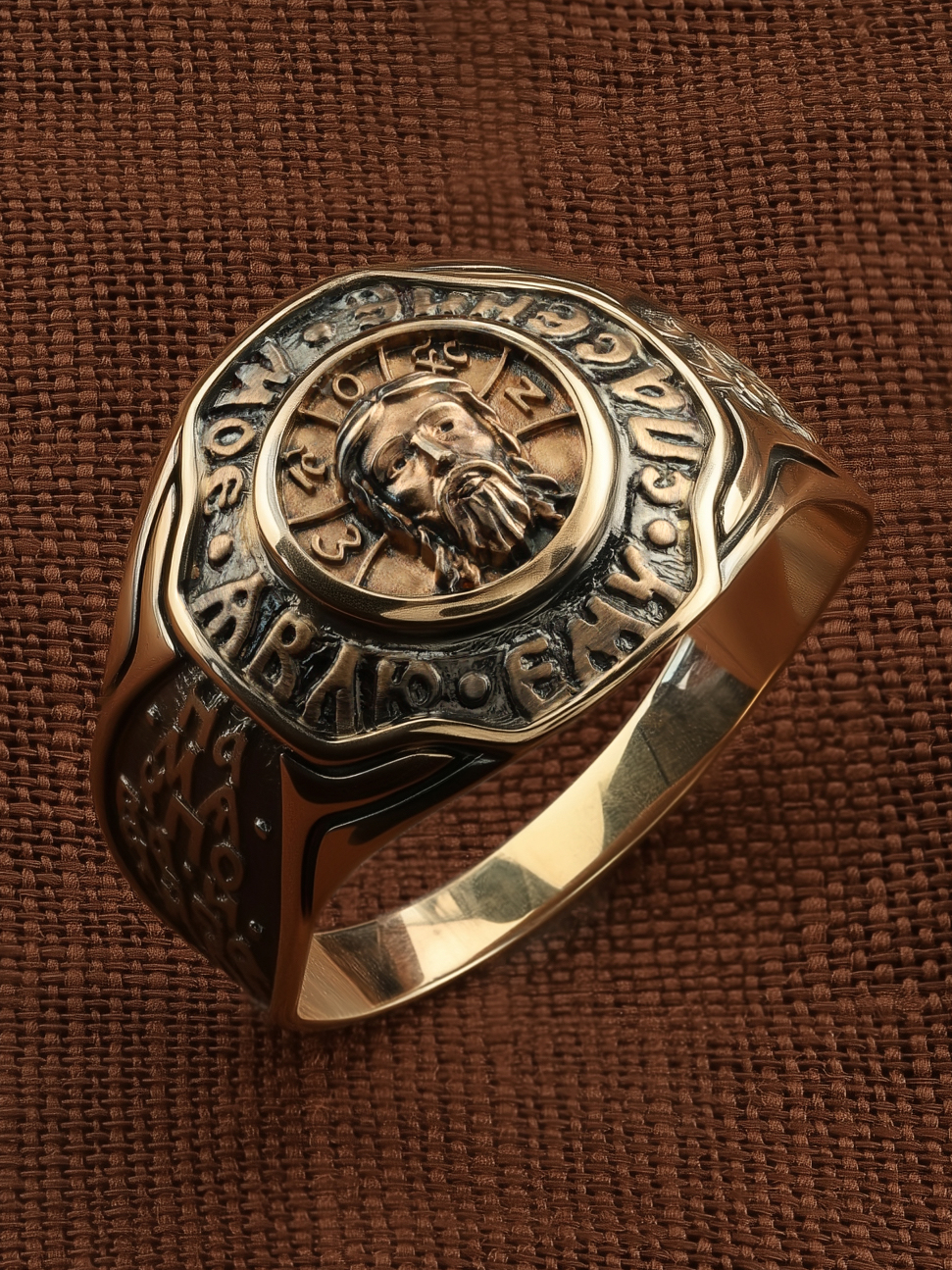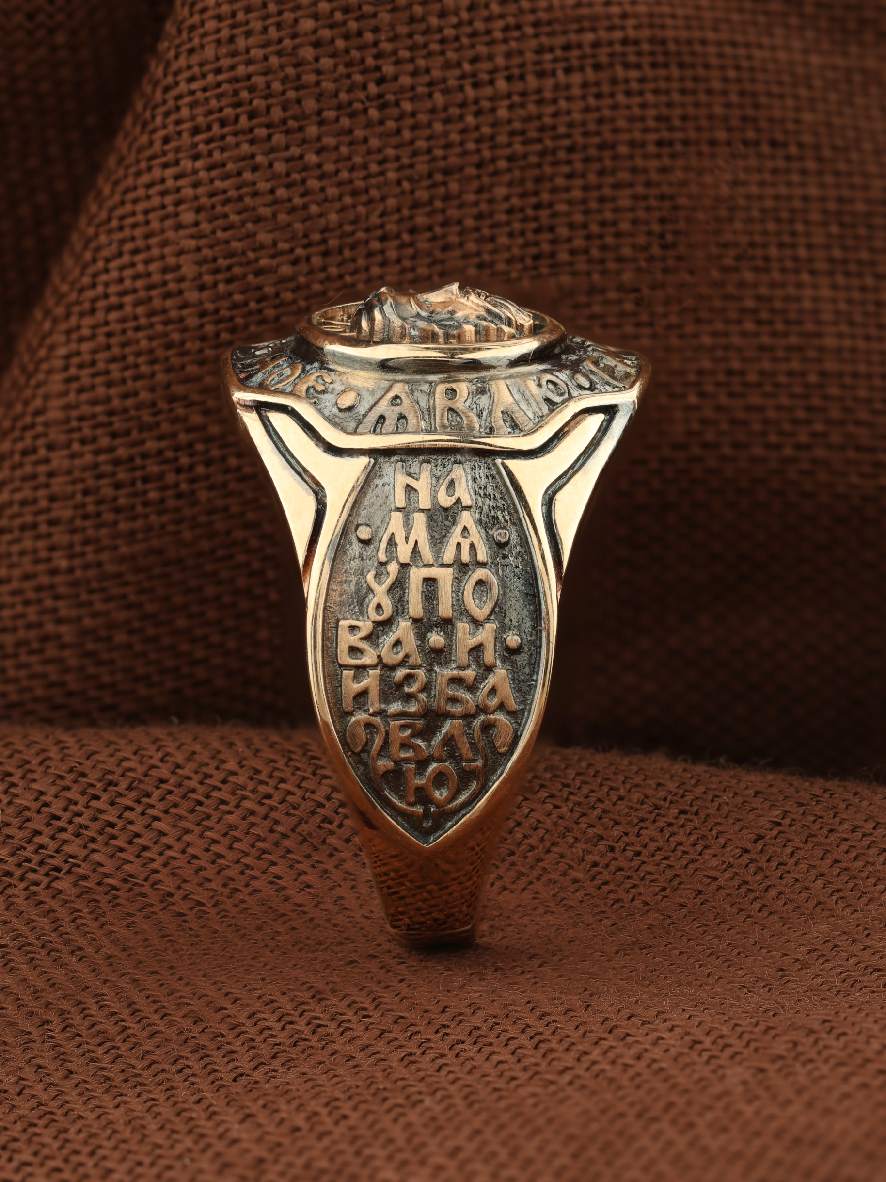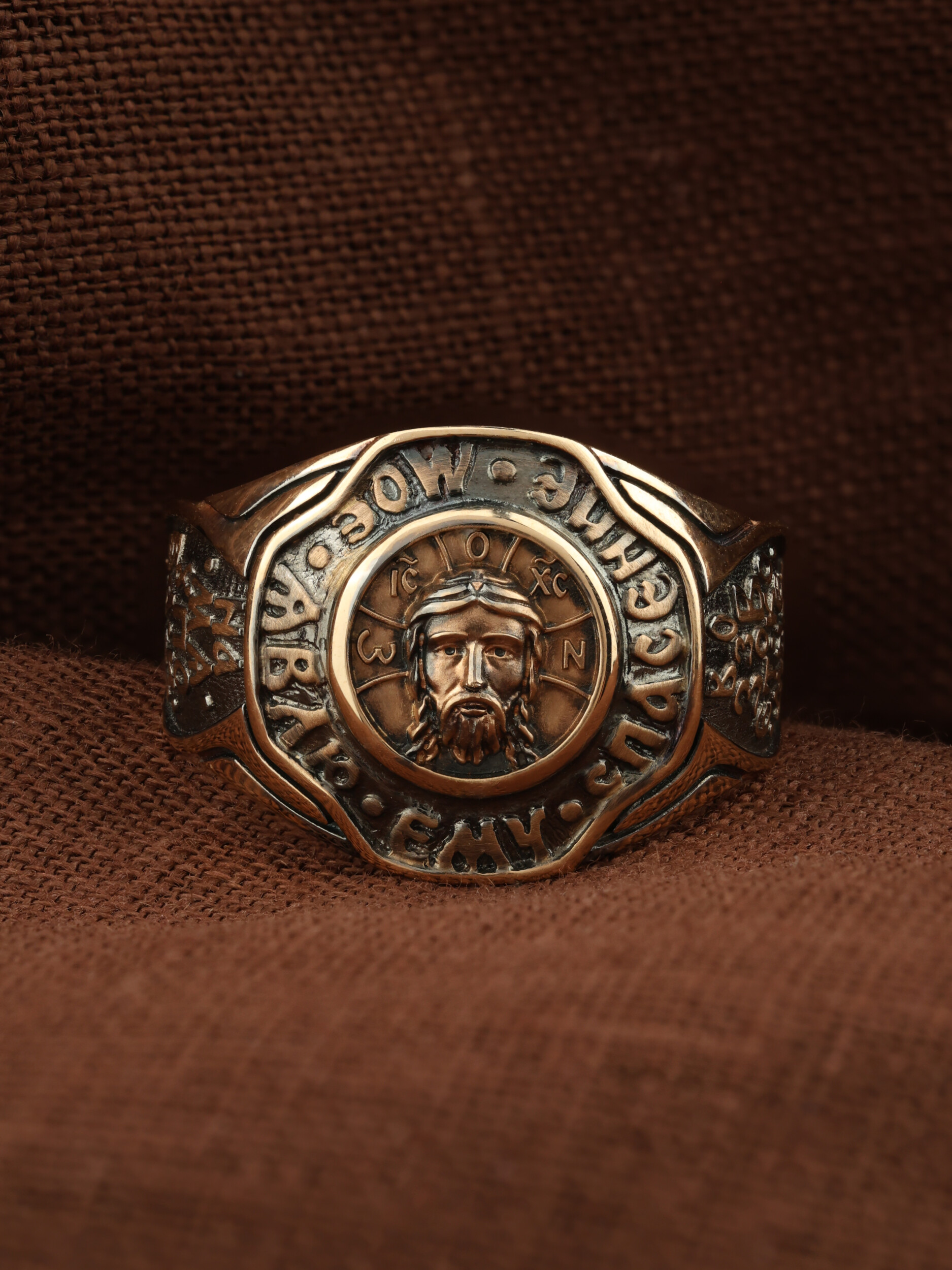 Кольцо «Господь Вседержитель» выполнено в древних христианских традициях. Спас Нерукотворный — образ Господа и Спасителя нашего Иисуса Христа, чудесно отпечатавшийся на плате, котором Христос вытер свой лик. Согласно Преданию, изложенному в Четьи Минее, Авгарь V Ухама, больной проказой, послал ко Христу своего архивария Ханнана (Ананию) с письмо, в котором просил Христа прийти в Едессу и исцелить его. Ханнан же был художником, и Авгарь поручил ему, если Спаситель не сможет прийти, то написать хотя бы Его образ и принести ему. Видя, что Ханнан хочет сделать Его портрет, Христос потребовал воды, умылся, вытер Свой лик платом, и на этом плате отпечатался Его образ. Спаситель передал этот плат Ханнану с повелением отнести с ответным письмом пославшему его. Получив портрет, Авгарь исцелился от главного своего недуга, но лицо его оставалось еще поврежденным. После Пятидесятницы в Едессу пошёл святой апостол Фаддей, один из 70-ти, закончил исцеление Авгаря и обратил его в христианство. Авгарь прикрепил образ к доске и поместил в нише над городскими воротами, убрав оттуда находившегося там идола. Лик Спасителя — в трехчастно разделенном нимбе, на котором начертана греческая монограмма «WOИ», что означает «Сущий» или «Тот, кто есть». Вокруг образа Спаса Нерукотворного надпись: «Явлю ему спасение Моё»