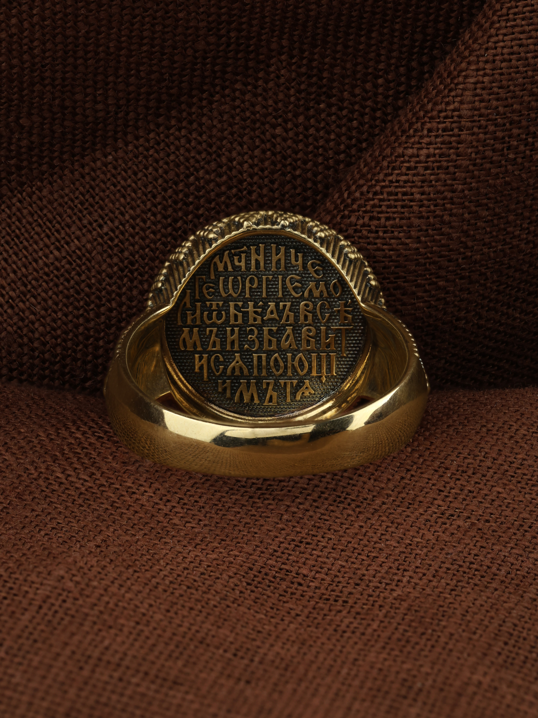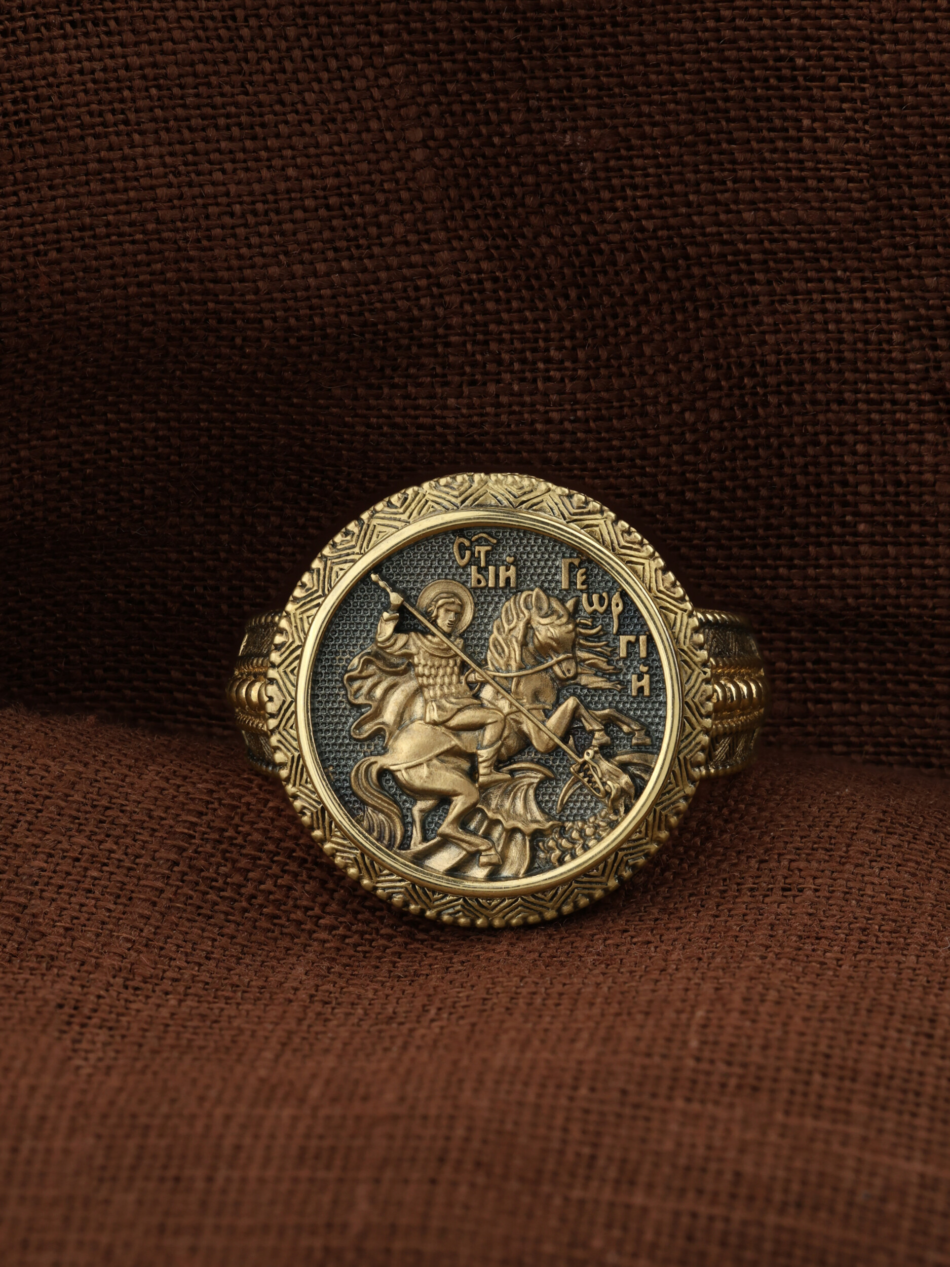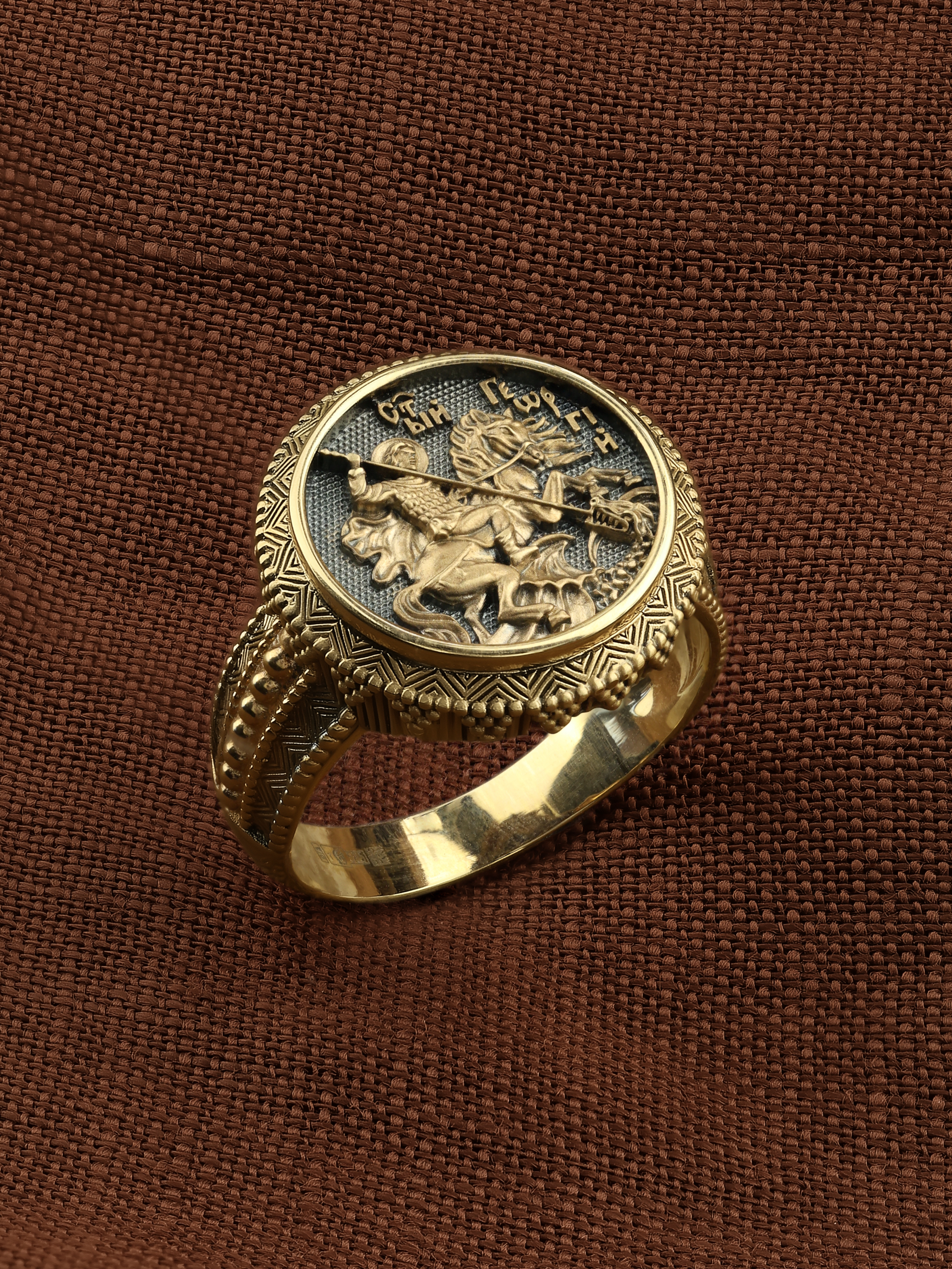 Кольцо «Святой Великомученик Георгий Победоносц» выполнено в древних христианских традициях. Основой композиции является изображение Святого Великомученика Георгия Победоносца — одного из самых почитаемых и удивительных святых. Георгий родился в Каппадокии (Малая Азия) в семье богатых и знатных горожан. Юношей поступил на службу к римскому императору Диоклетиану, за отличное знание военного дела и проявленную в боях и походах храбрость был приближен к императору и удостоен высокого воинского звания. Во время начавшихся гонений на христиан, перешел на сторону гонимых и, отвергнув человеческий страх, стал ярым проповедником учения Христа. Мучители подвергли опального воеводу жесточайшим восьмидневным пыткам и казнили его (обезглавили) в возрасте около тридцати лет в 303 году. На Руси он известен как Юрий или Егорий, заступник для верующих, чья жизнь имеет какое-либо отношение к военным делам, помощник в крестьянском труде. Георгий изображен как воитель, сидящий на вздыбленном коне и поражающий копьем огнедышащего змея. Справа над образом изображена благословляющая Божия десница. Змей символизирует собою сатанинские силы. Молитвами вознесенными к Всевышнему и своей непреклонной верой он смог одолеть чудовище. Святой убил змея, спас царскую дочь, принесенную в жертву, и жителей города, их души от влияния дьявола, породив в них надежду и веру в Господа, призывая людей принять христианскую веру.