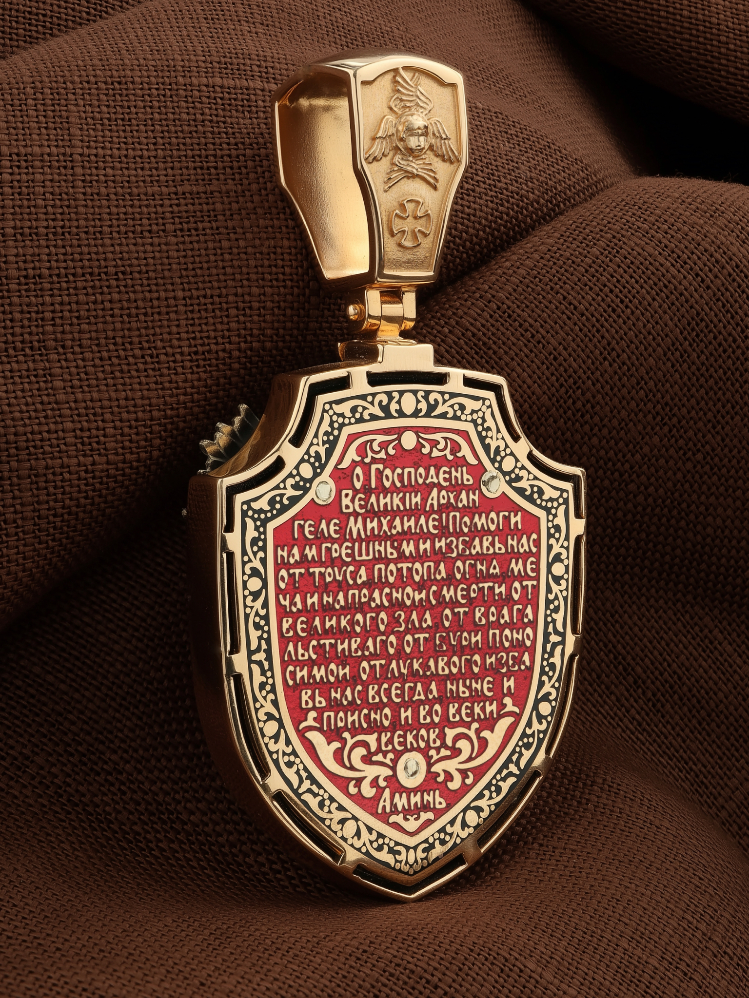 На оборотной стороне образка написаны слова молитвы: «О, Господень Великий архангеле Михаиле! Помоги нам грешным и избавь нас от труса, потопа, огня, меча и напрасной смерти, от великого зла, от врага льстиваго, от бури поносимой, от лукавого избави нас навсегда, ныне и присно и во веки веков. Аминь.» На кулонном кольце изображен шестикрылый Серафим.