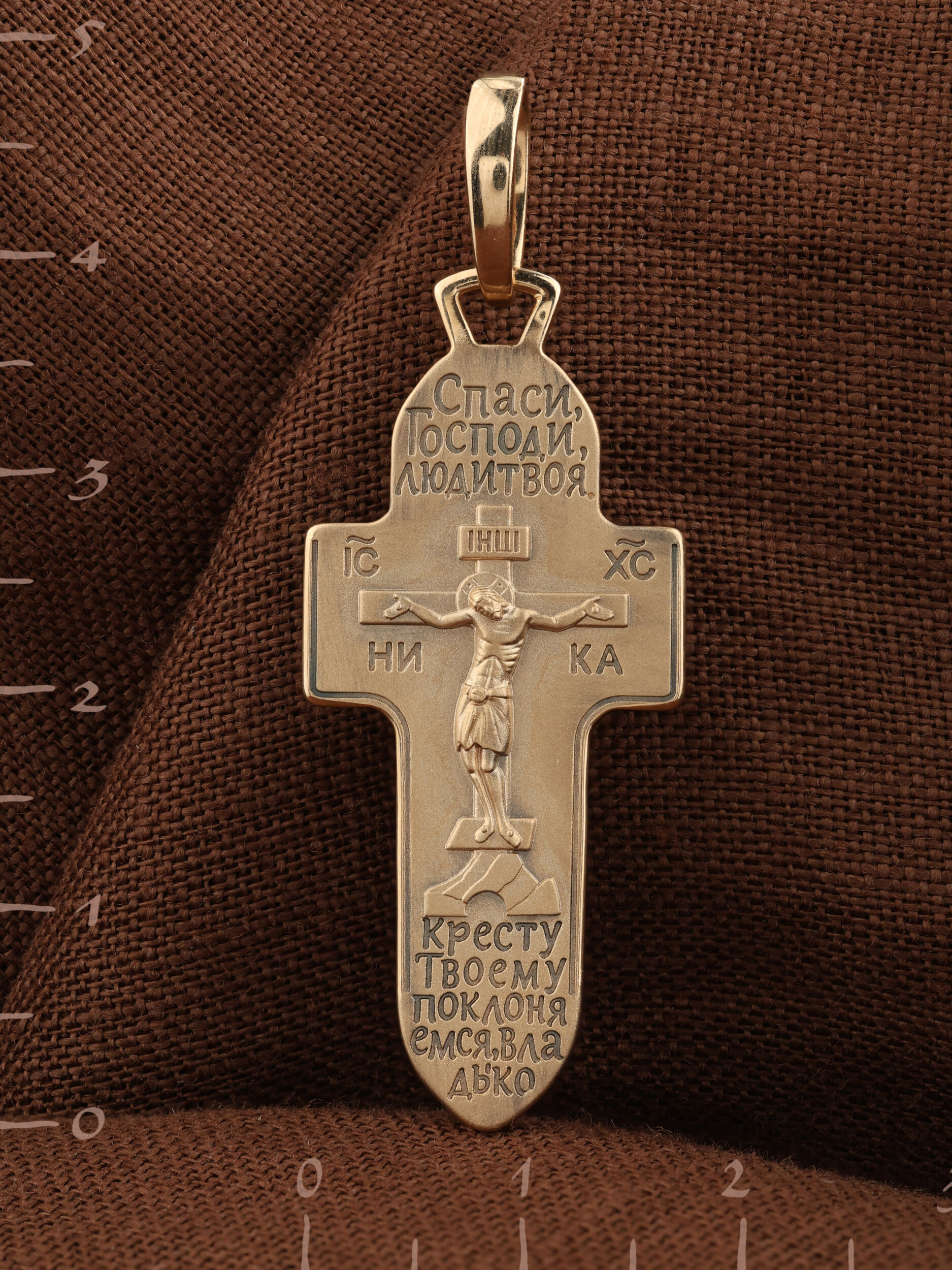 На лицевой стороне креста изображено Распятие Господа и Спасителя нашего Иисуса Христа. Крест- символ спасения и искупления рода человеческого, знамение победы над смертью и адом. Иисус Христос, как искупительная жертва освобождения человечества от власти греха, умер крестной смертью и в третий день воскрес. На верхней табличке, выше головы Иисуса, расположена надпись, составленная Понтием Пилатом — «IНЦI». Она означает «Иисус Назорей, Царь Иудейский». Надпись «IC» «ХC», означает Иисус Христос, помещается на разных сторонах поперечной перекладины креста. Под ней помещено слово «НIКА», что означает Победитель. Крест стоит на горе камней, символизирующих Голгофу.