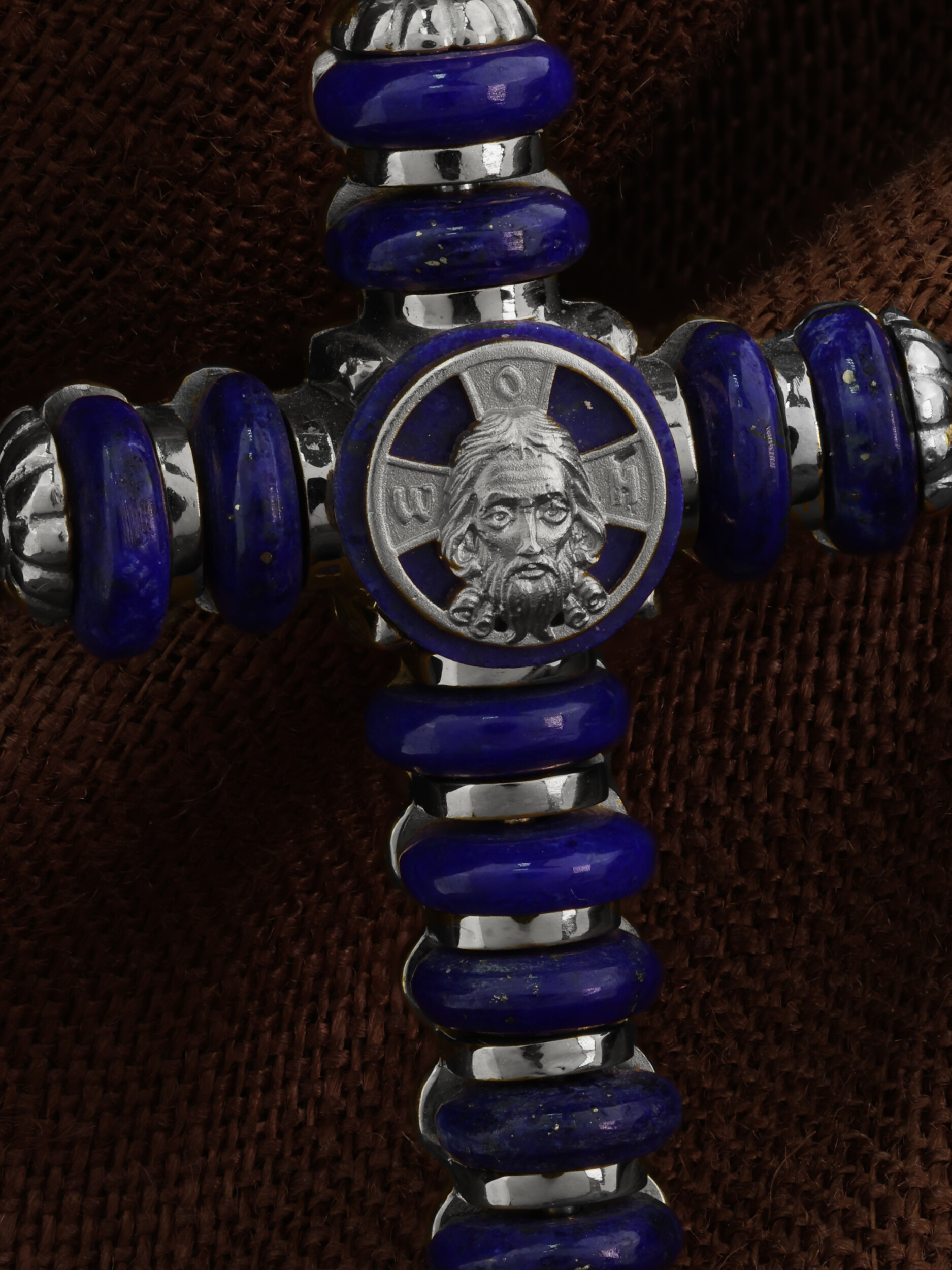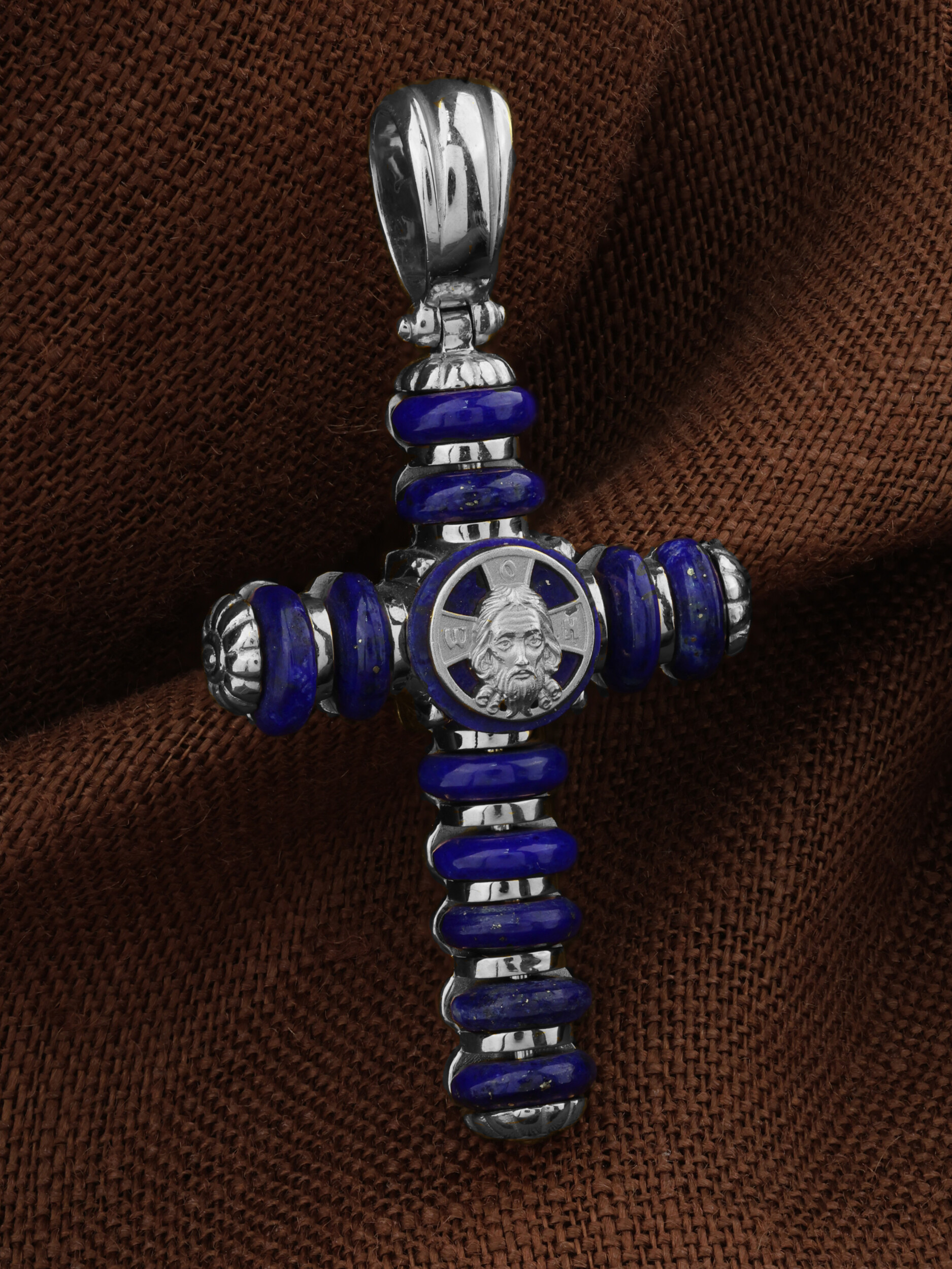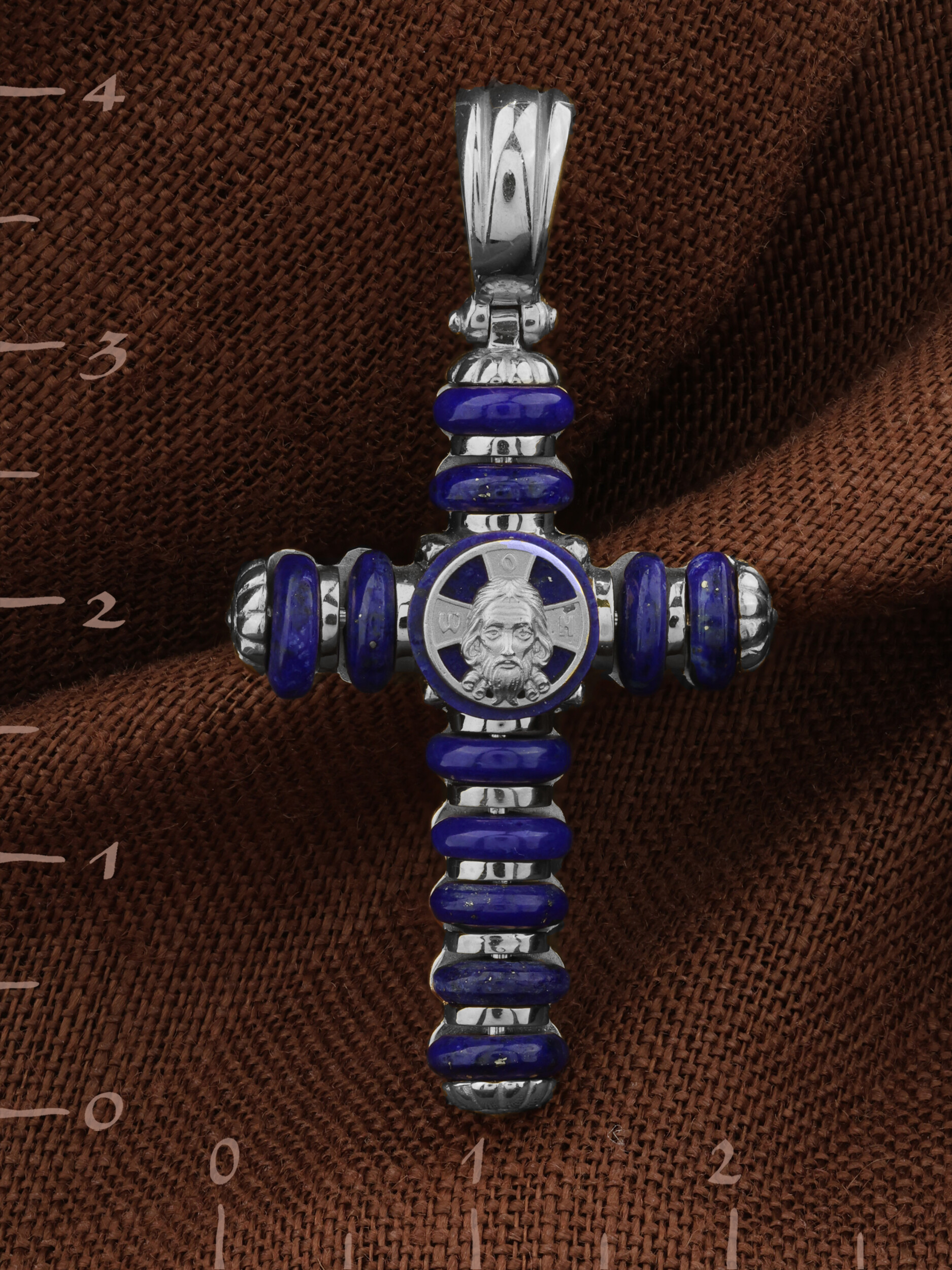 В центральной части лицевой стороны креста изображен Спас Нерукотворный — образ Господа и Спасителя нашего Иисуса Христа, чудесно отпечатавшийся на плате, котором Христос вытер свой лик. Согласно Преданию, изложенному в Четьи Минее, Авгарь V Ухама, больной проказой, послал ко Христу своего архивария Ханнана (Ананию) с письмо, в котором просил Христа прийти в Едессу и исцелить его. Ханнан же был художником, и Авгарь поручил ему, если Спаситель не сможет прийти, то написать хотя бы Его образ и принести ему. Видя, что Ханнан хочет сделать Его портрет, Христос потребовал воды, умылся, вытер Свой лик платом, и на этом плате отпечатался Его образ. Спаситель передал этот плат Ханнану с повелением отнести с ответным письмом пославшему его. Получив портрет, Авгарь исцелился от главного своего недуга, но лицо его оставалось еще поврежденным. После Пятидесятницы в Едессу пошёл святой апостол Фаддей, один из 70-ти, закончил исцеление Авгаря и обратил его в христианство. Авгарь прикрепил образ к доске и поместил в нише над городскими воротами, убрав оттуда находившегося там идола.