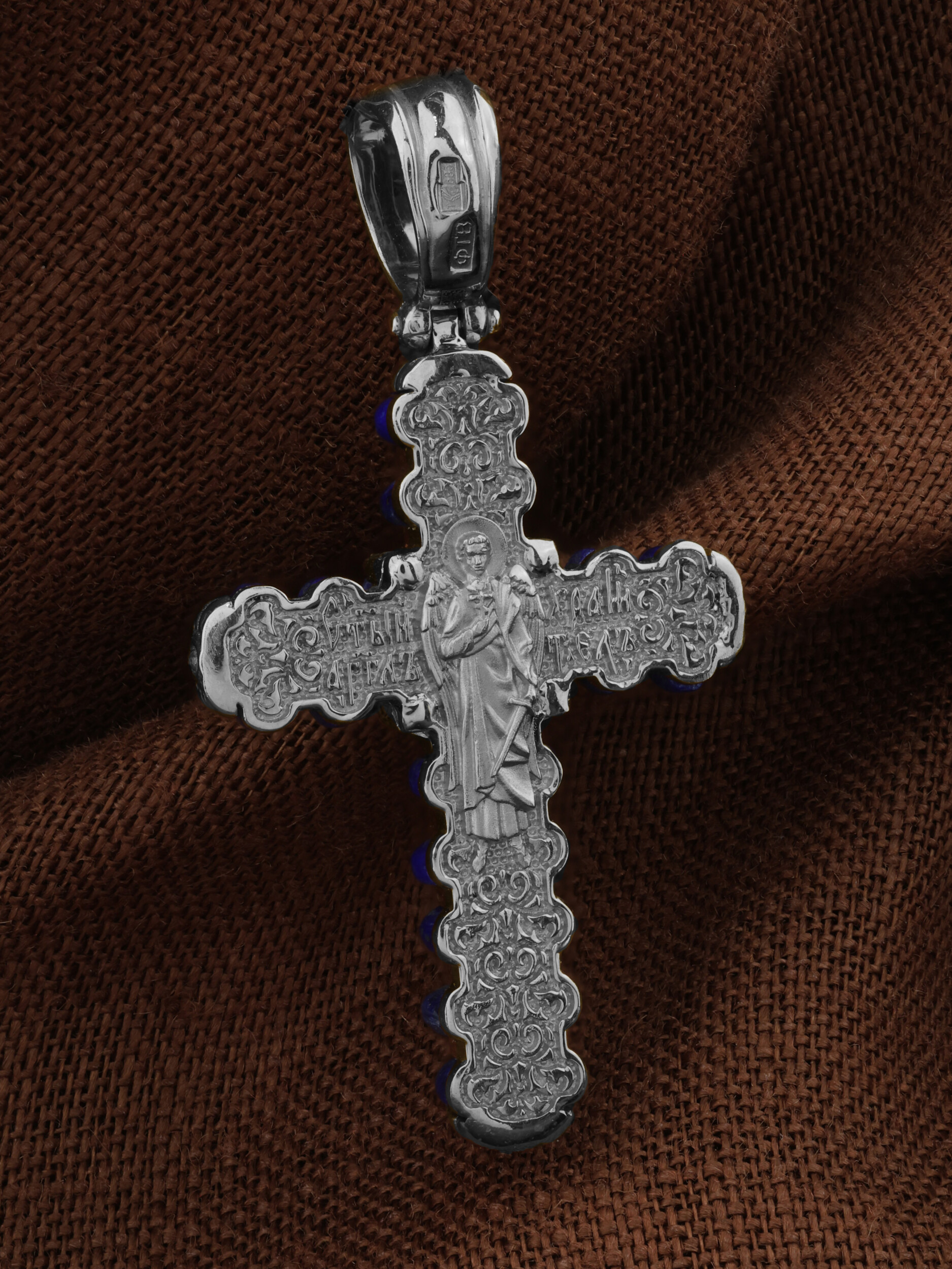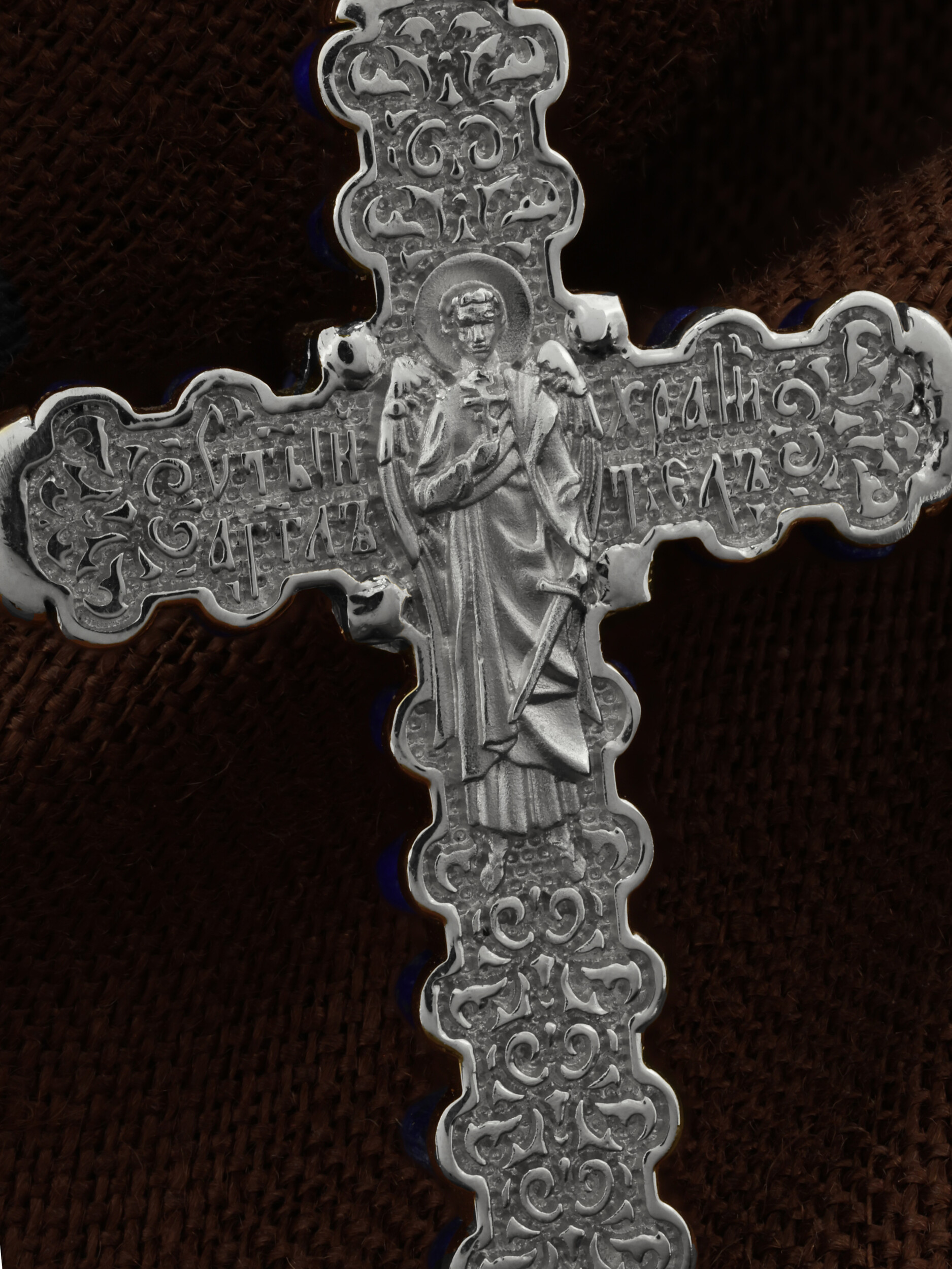 На оборотной стороне креста изображен святой Ангел-Хранитель в виде прекрасного юноши держащего в правой руке крест, а в левой — сферу. Ангел-Хранитель — это Ангел приставляемый Богом к человеку при крещении для охраны и помощи в добрых делах. Невидимо пребывая при нас постоянно, он, руководствуя нас ко спасению, не только по нашему желанию таинственно наставляет нас на все доброе и полезное, не только возносит наши молитвы к Богу, но еще и сам от себя охраняют и защищают нас от врагов видимых и невидимых, ходатайствует за нас пред Богом.